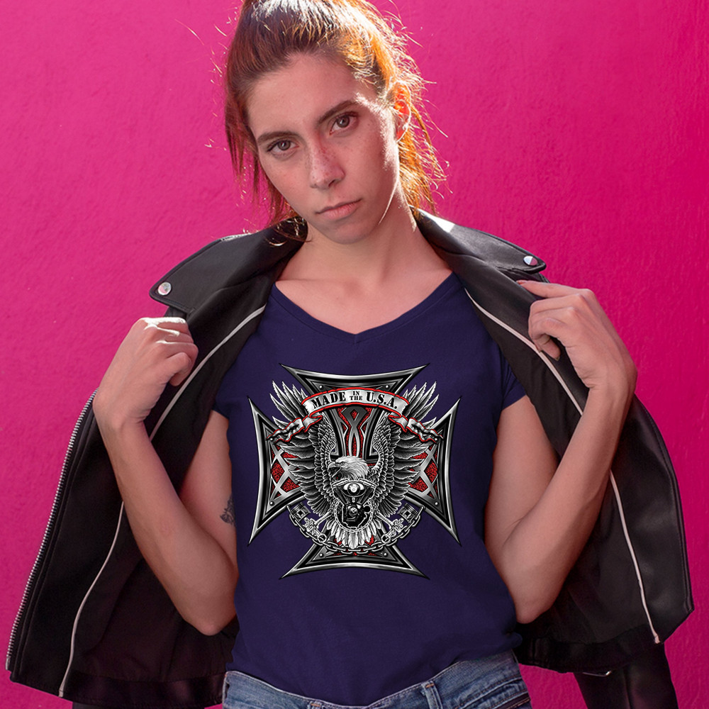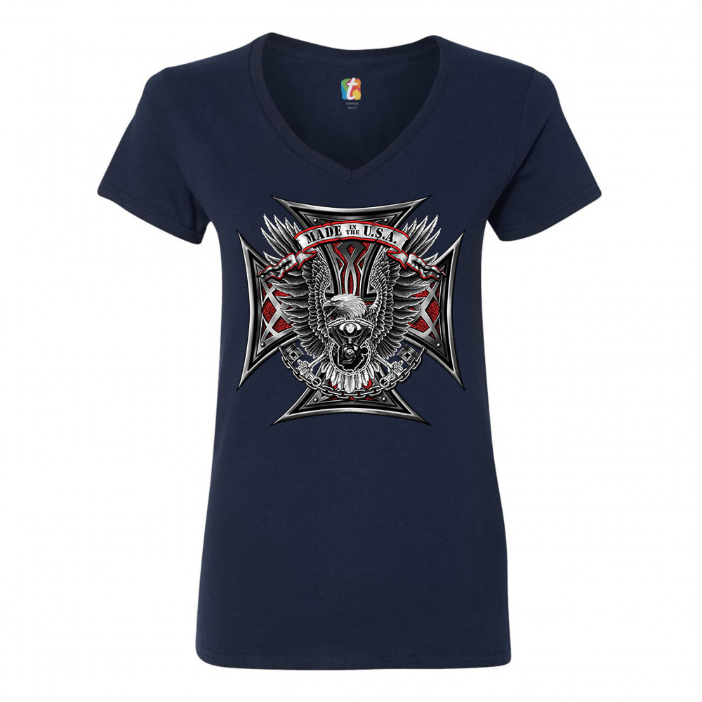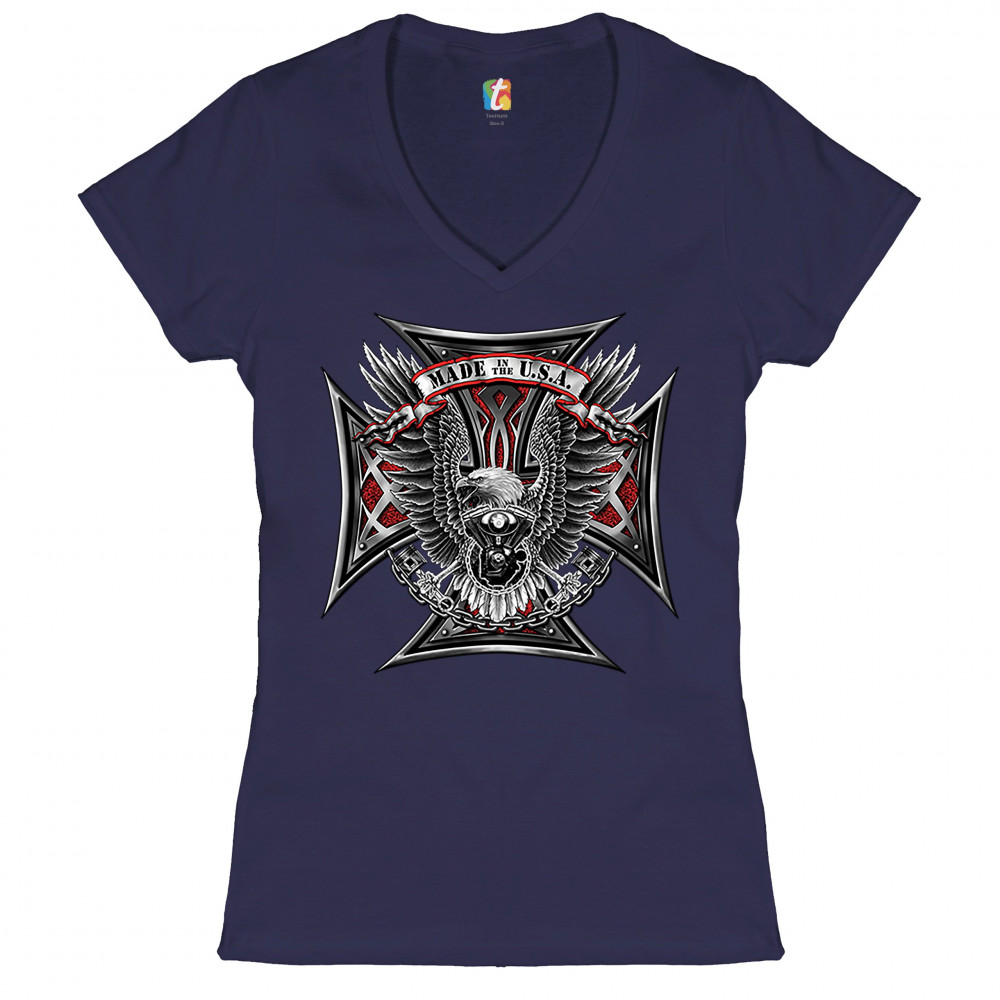 MADE IN THE USA BIKER CROSS women's v-neck t-shirt bald eagle motorcycle tee navy blue