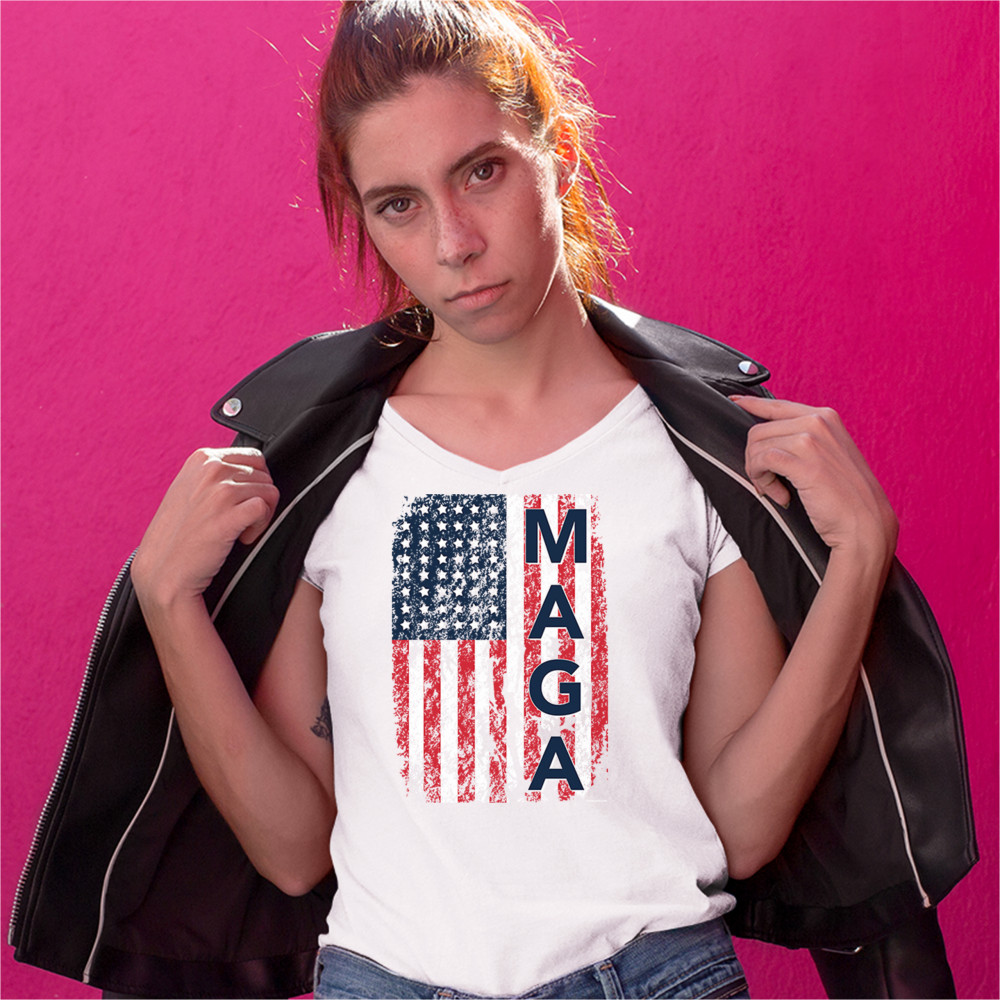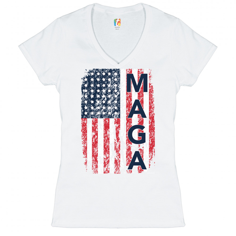 MAGA FLAG women's v-neck t-shirt donald trump 2020 flag keep america great tee white