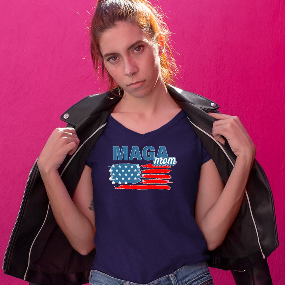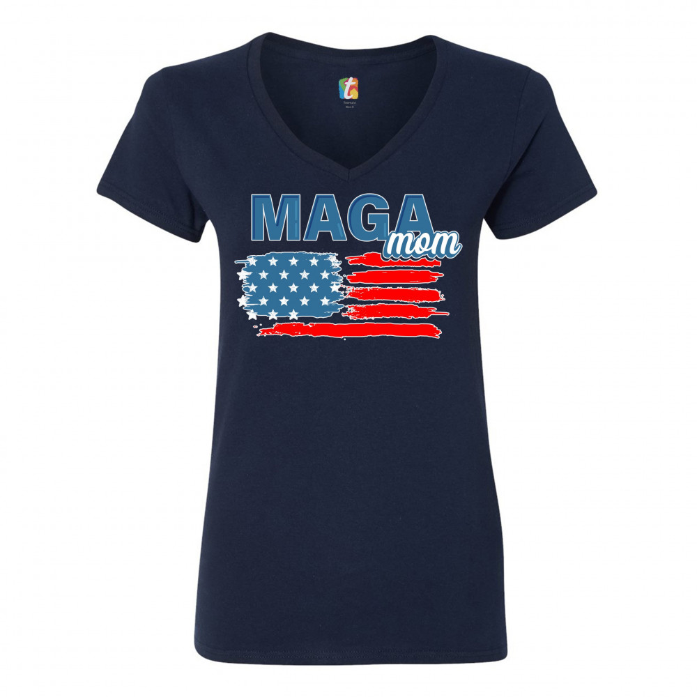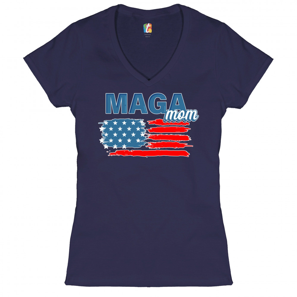 MAGA MOM AMERICAN FLAG women's v-neck t-shirt donald trump 2020 vote red tee navy blue