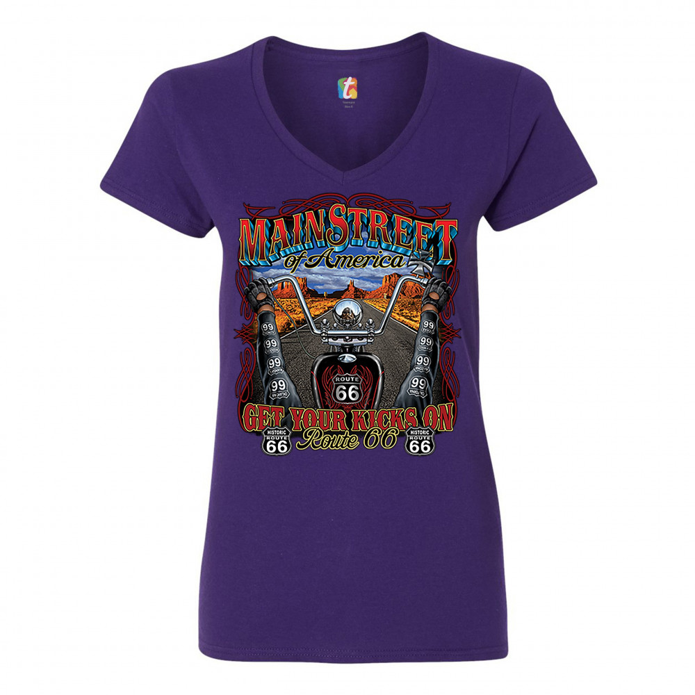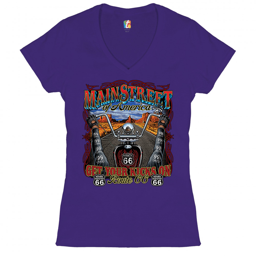 A print featuring a POV of a biker riding a chopper on a Route 66. There are are numerous "Route 66" and "Historic Route 66" signs all over the print and the print says: "Main street of America" and "Gwt your kicks on Route 66". A great choice for a motor