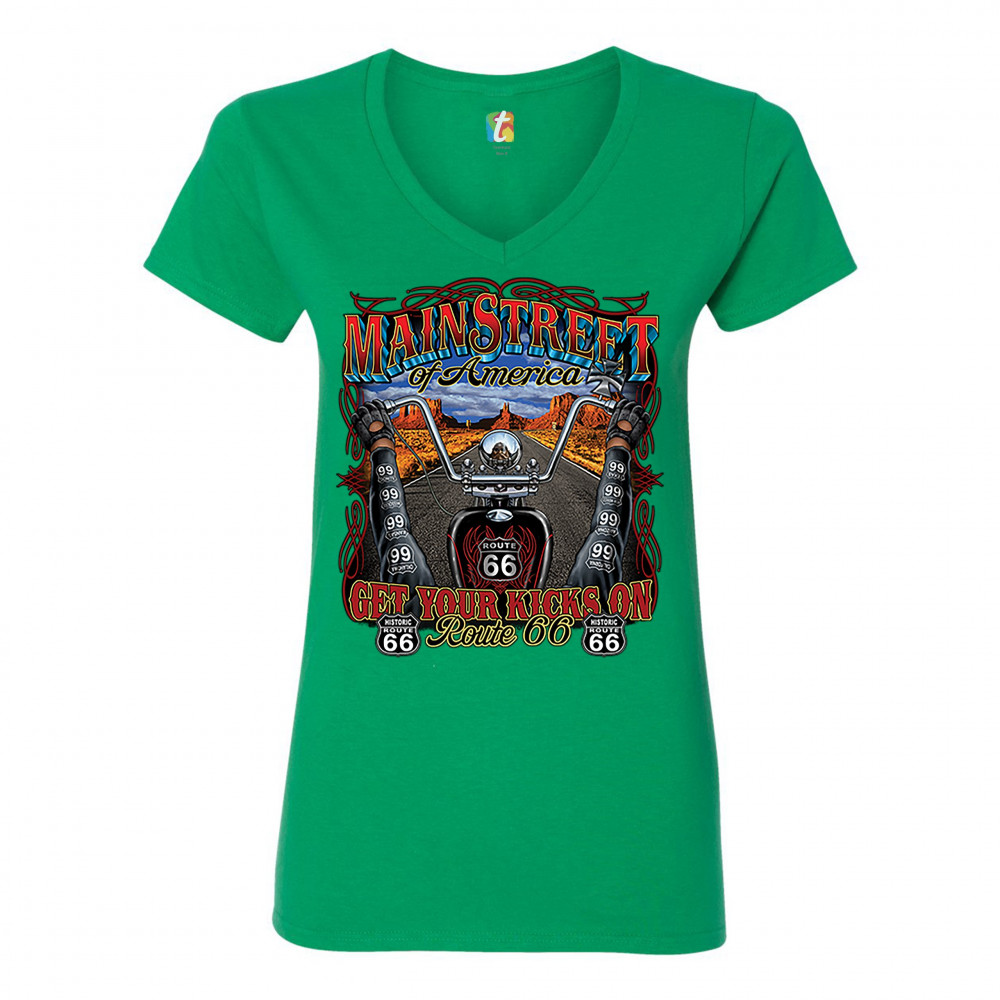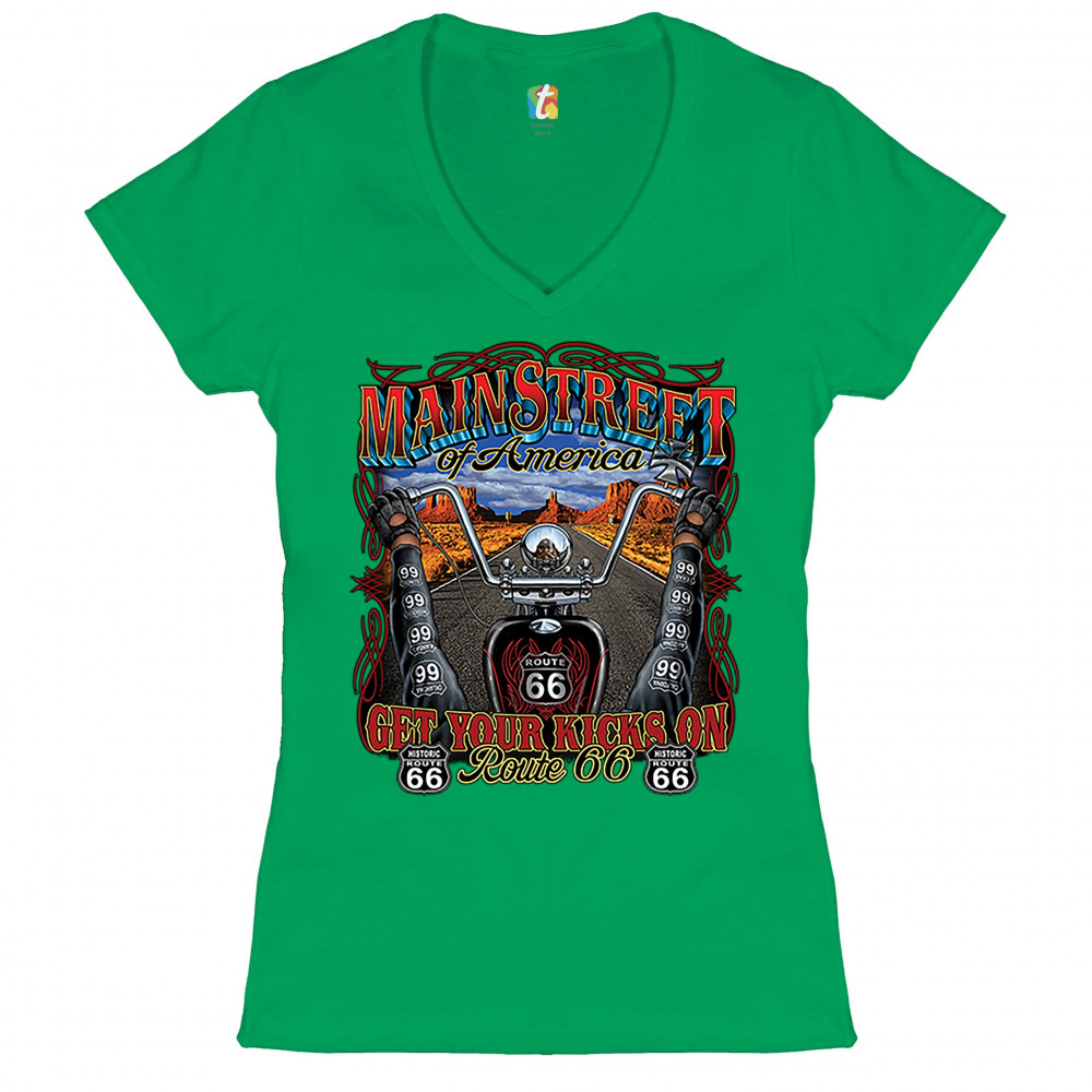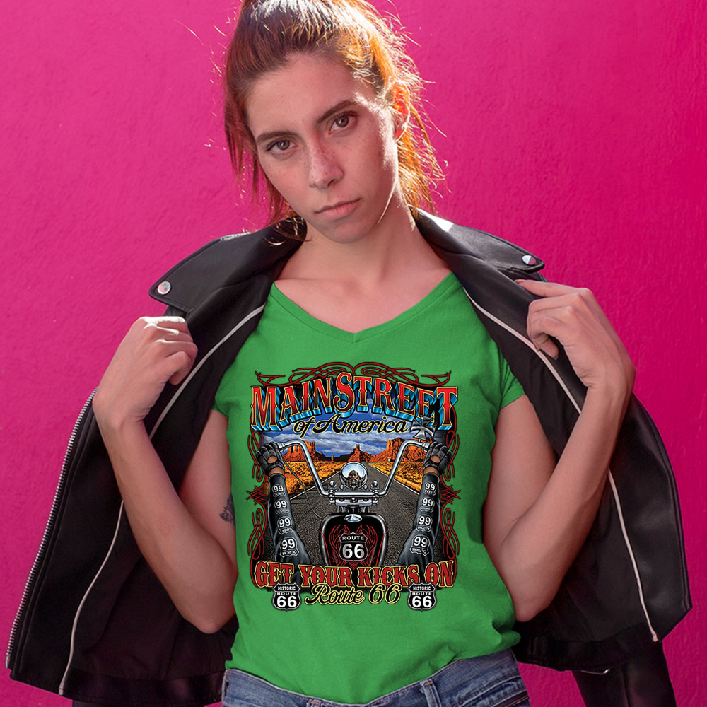 A print featuring a POV of a biker riding a chopper on a Route 66. There are are numerous "Route 66" and "Historic Route 66" signs all over the print and the print says: "Main street of America" and "Gwt your kicks on Route 66". A great choice for a motor