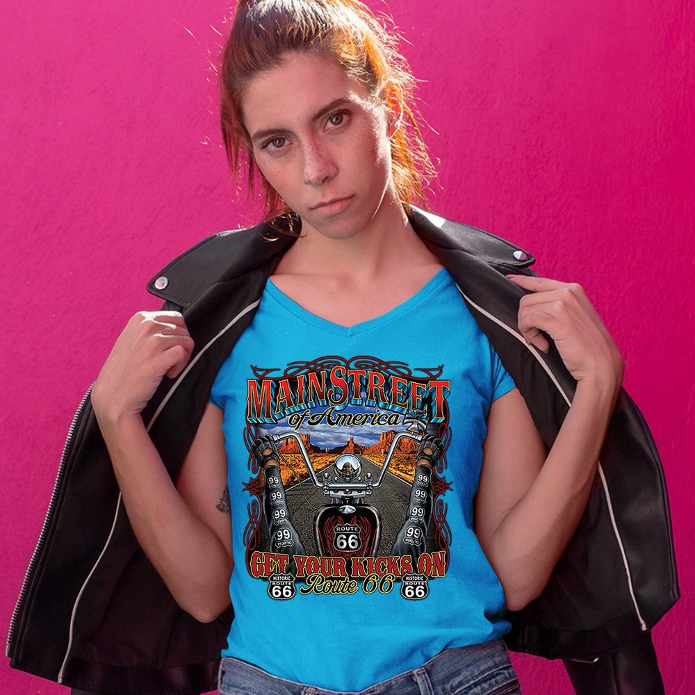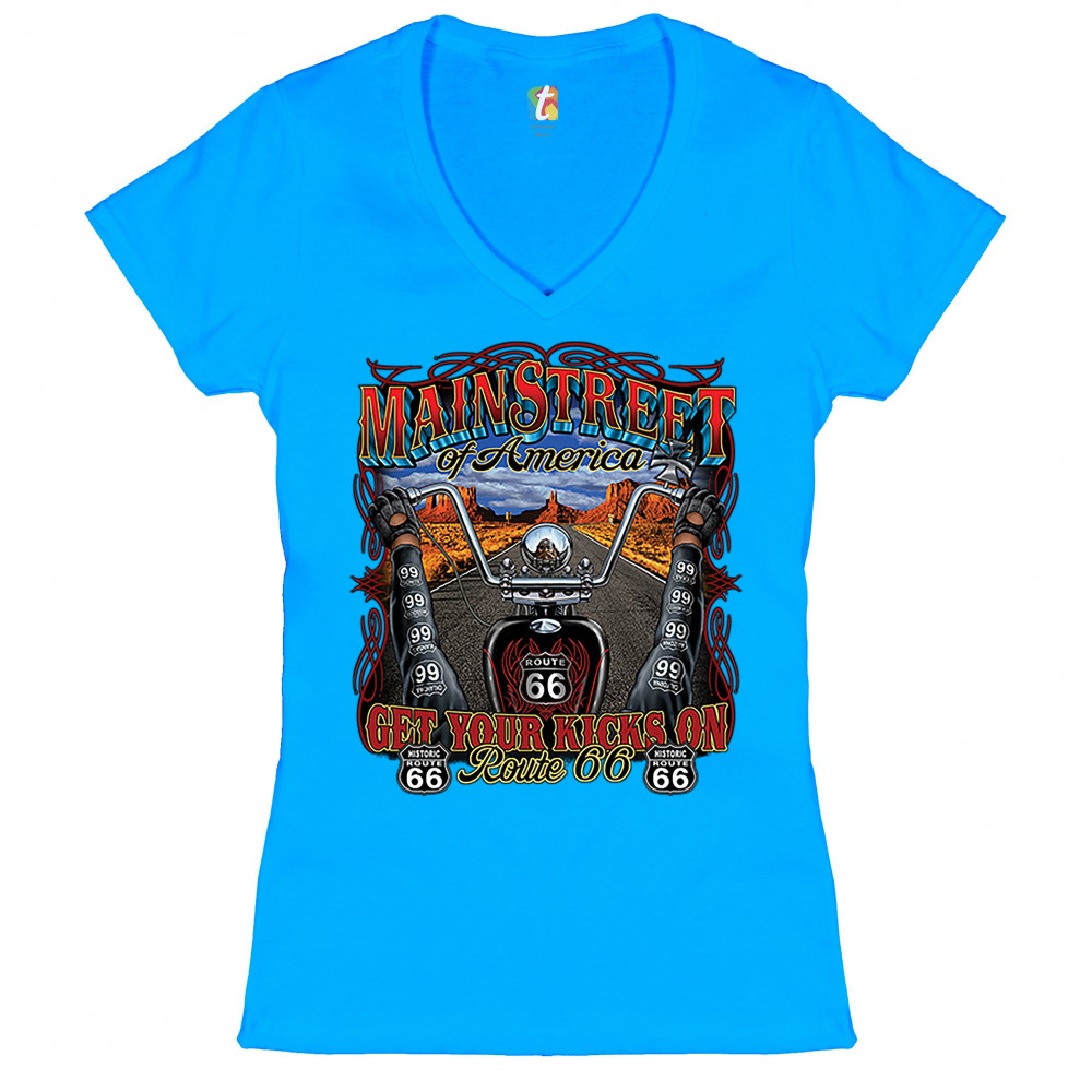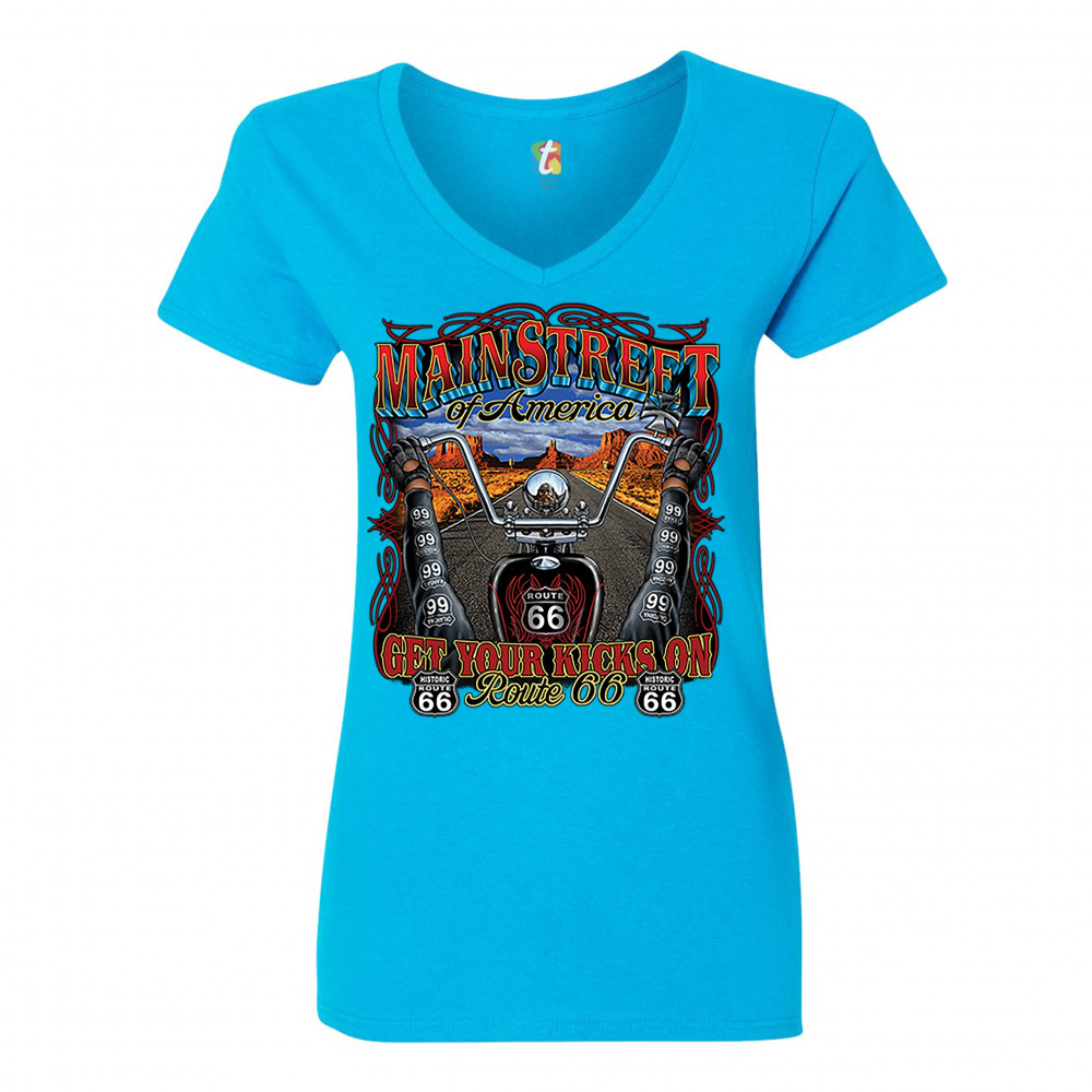 MAIN STREET OF AMERICA women's v-neck t-shirt get your kicks on route 66 tee turquoise