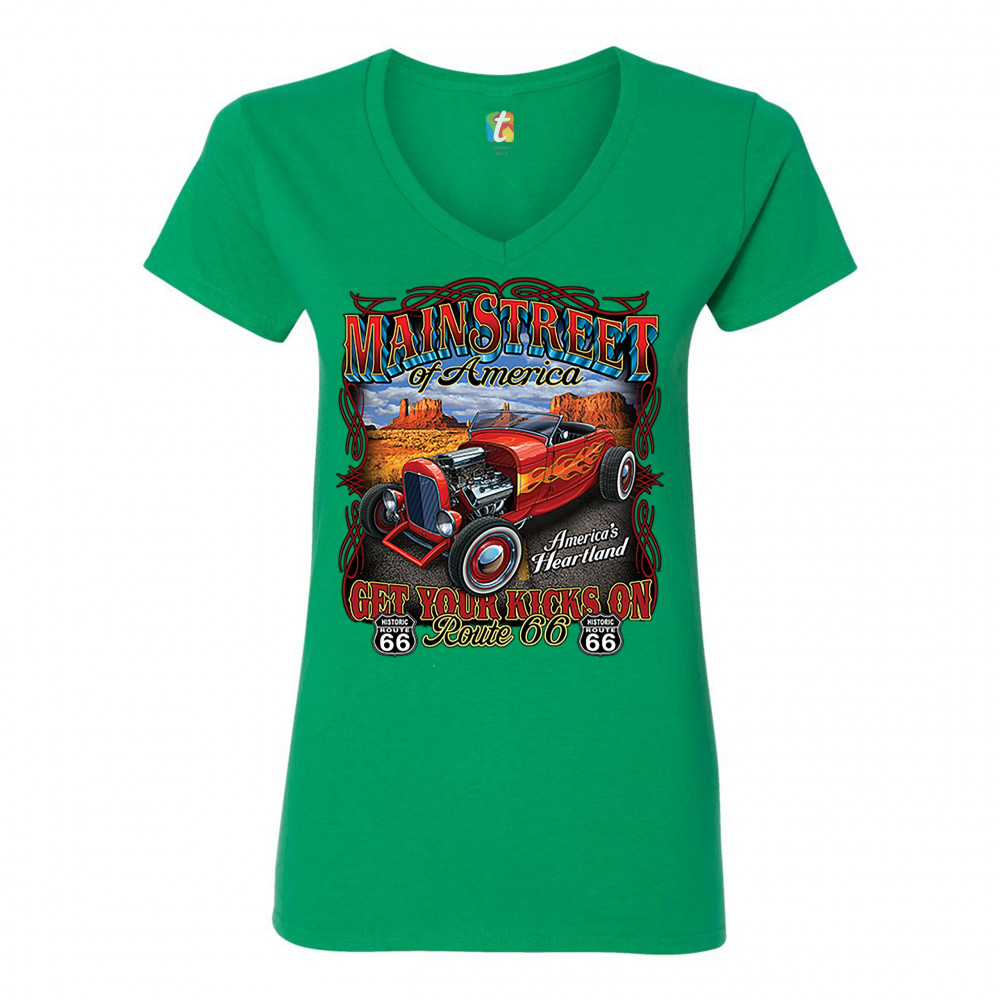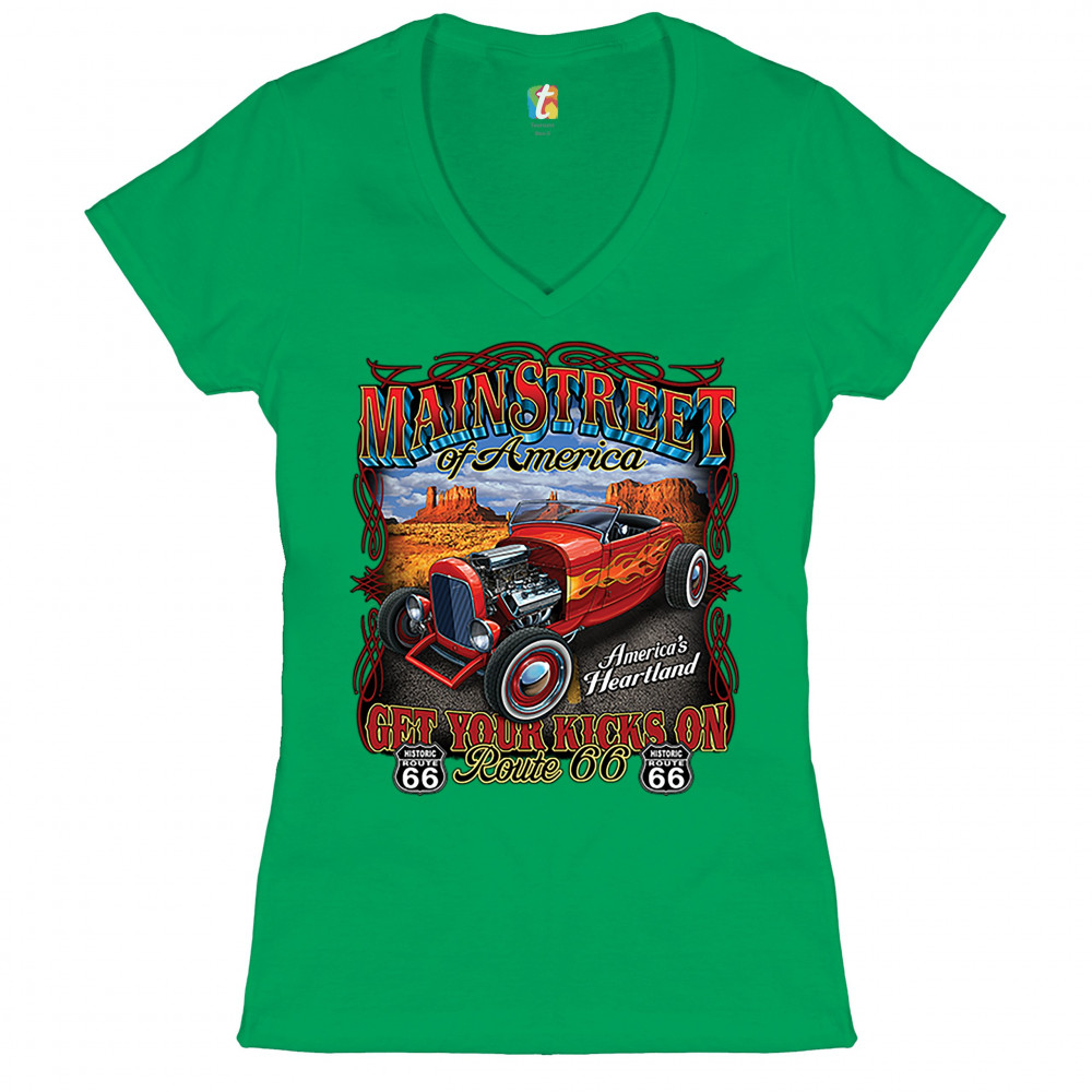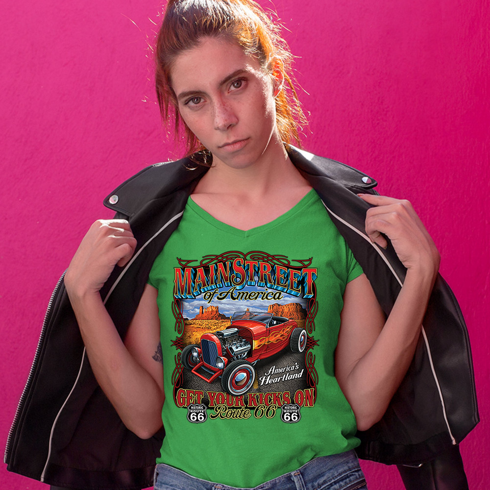 A print featuring a vintage hot rod with an exposed engine and flame paint job parked on a highway. The print says: "Main Street of America", "America's Heartland" and "Get Your Kicks on Route 66". The print also features two Route 66 signs. A great choic