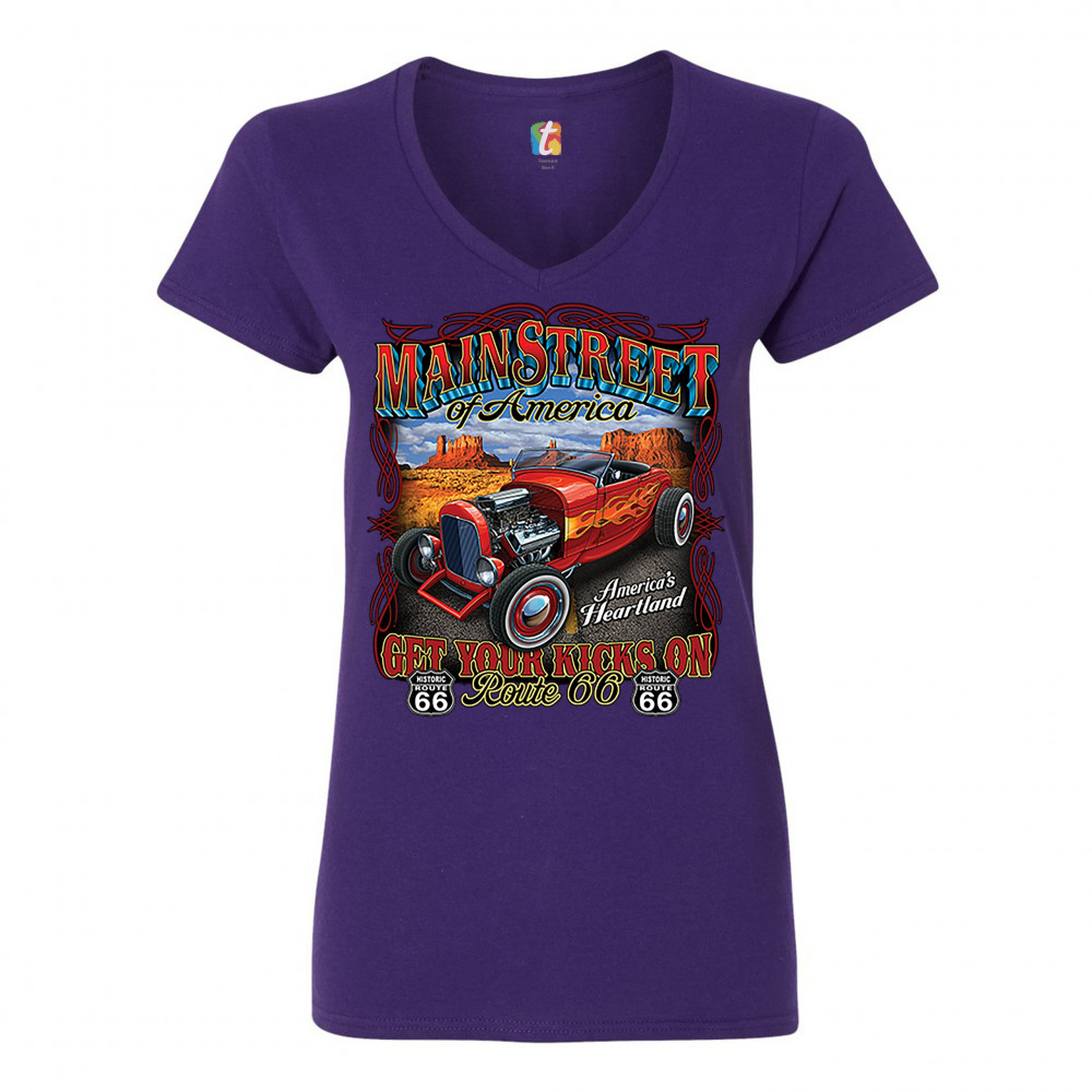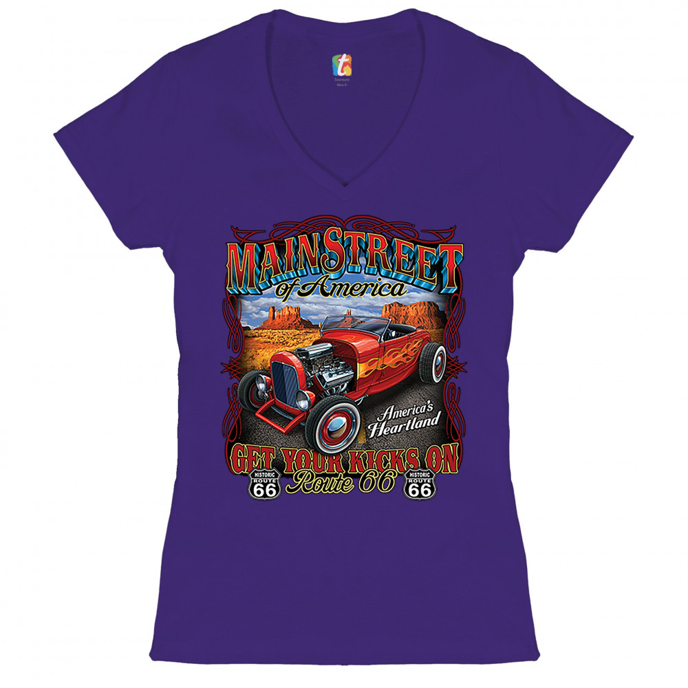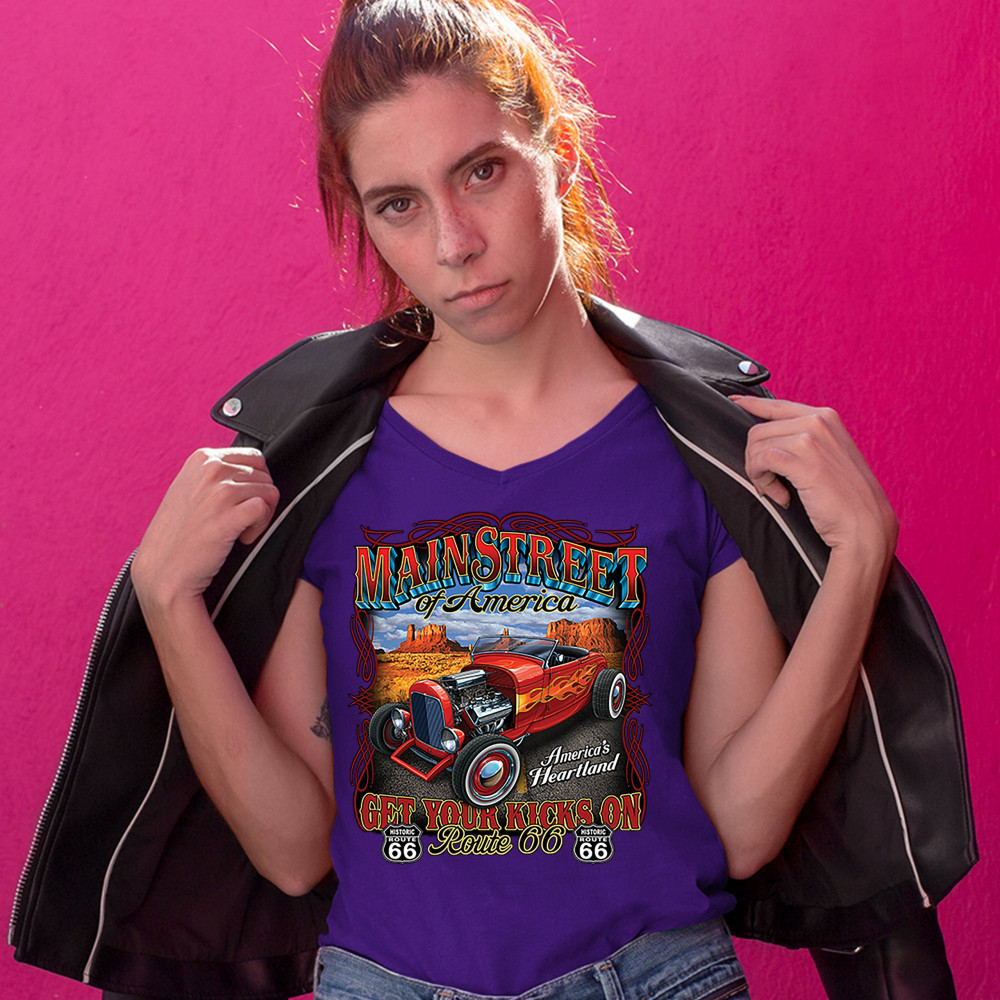A print featuring a vintage hot rod with an exposed engine and flame paint job parked on a highway. The print says: "Main Street of America", "America's Heartland" and "Get Your Kicks on Route 66". The print also features two Route 66 signs. A great choic