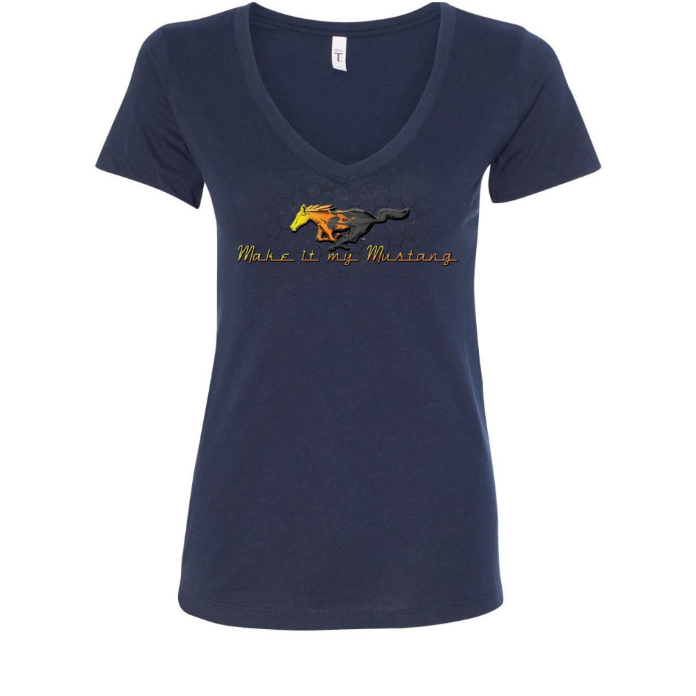 MAKE IT MY MUSTANG women's v-neck t-shirt honeycomb american classic fire horse navy blue