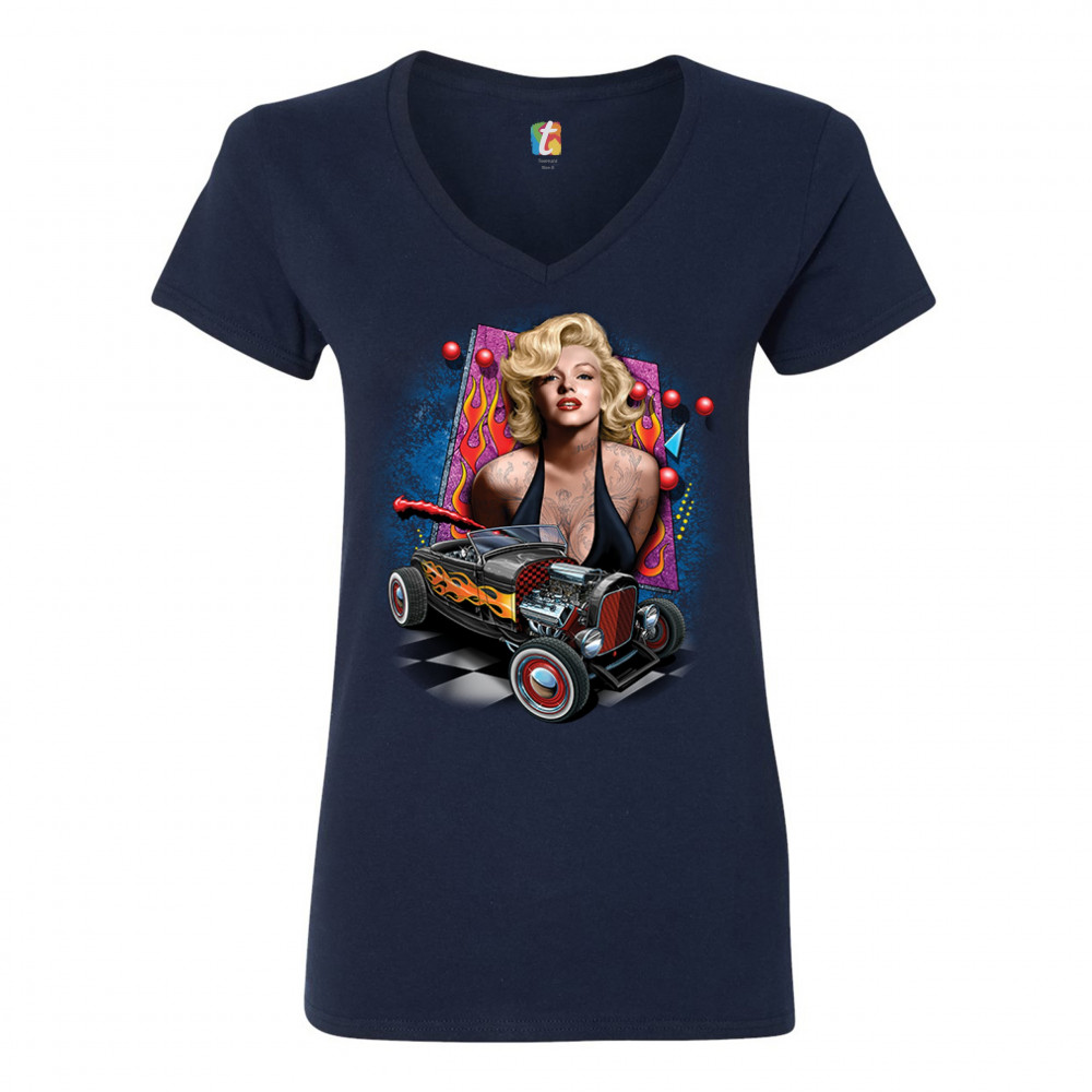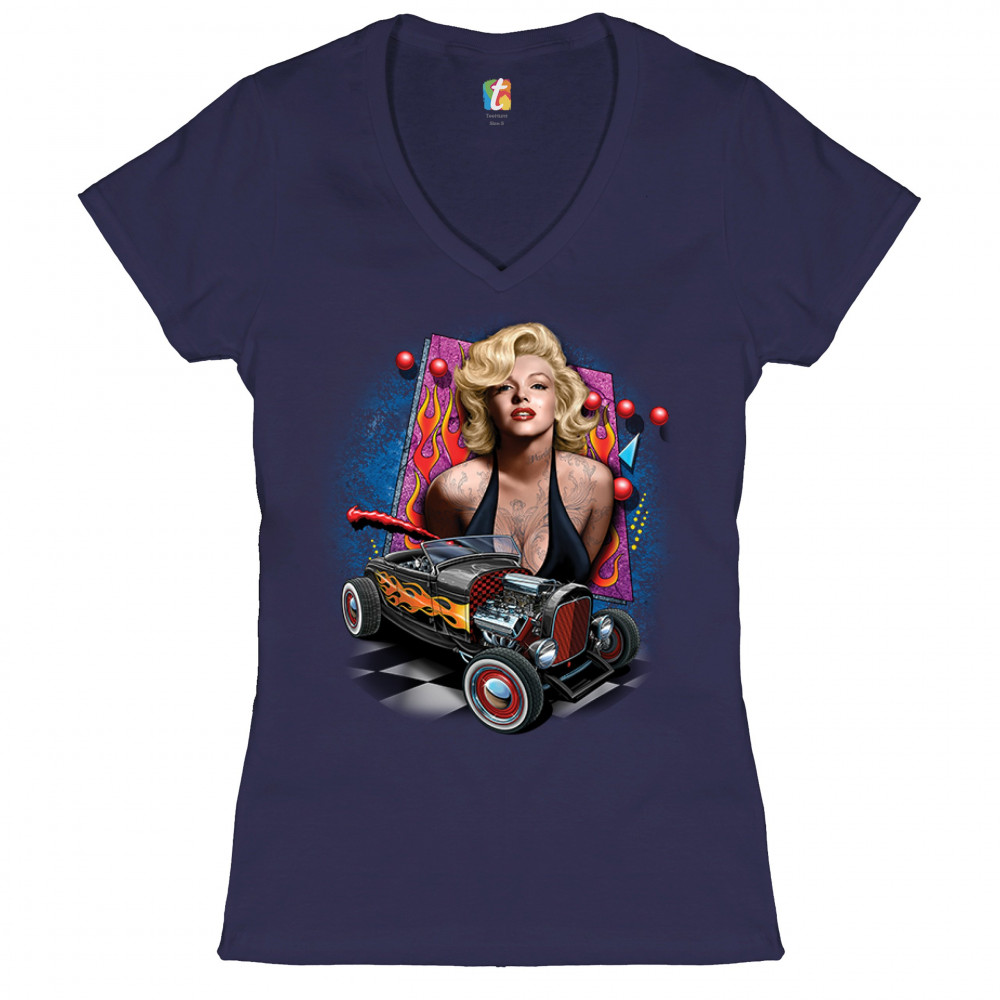 MARILYN MONROE HOT ROD women's v-neck t-shirt vintage route 66 drag racing tee navy blue