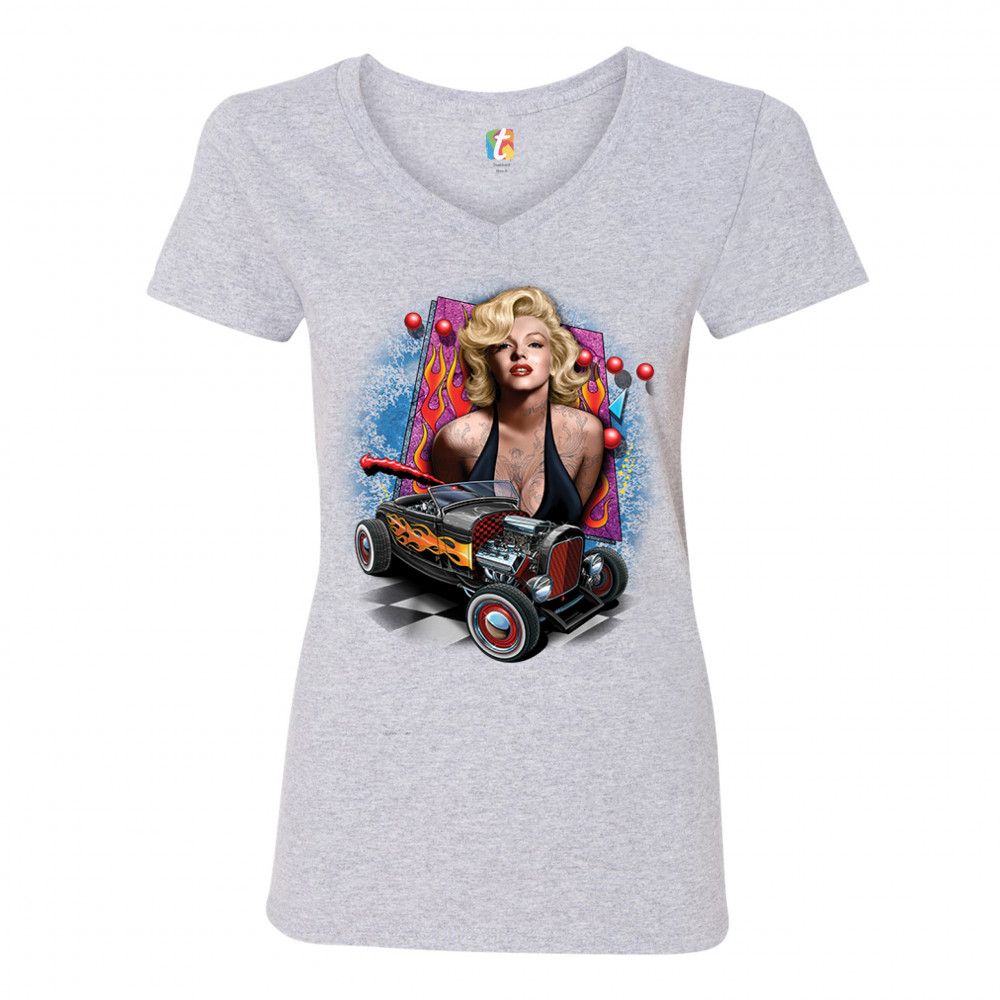 MARILYN MONROE HOT ROD women's v-neck t-shirt vintage route 66 drag racing tee gray