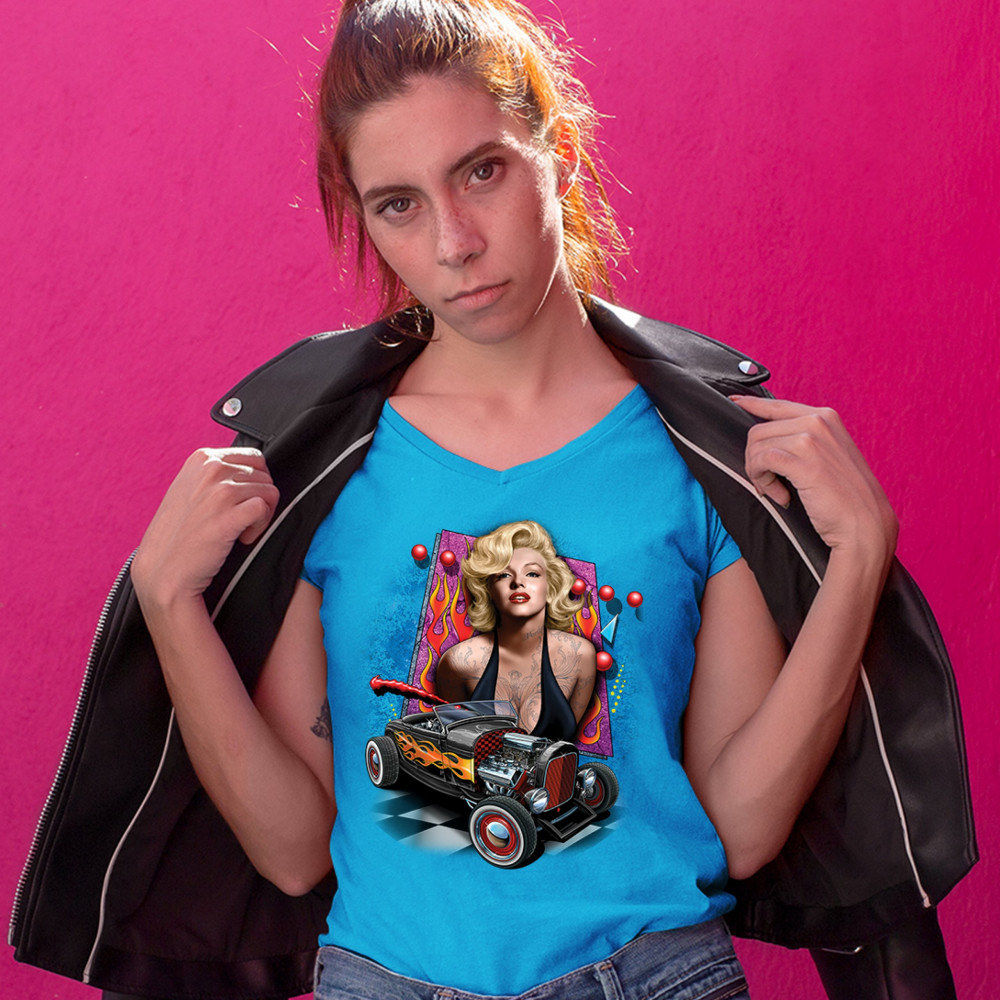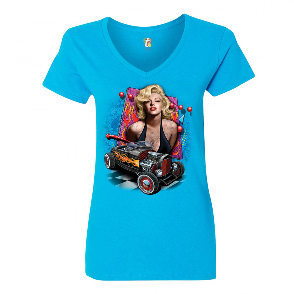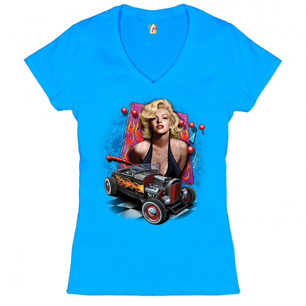 MARILYN MONROE HOT ROD women's v-neck t-shirt vintage route 66 drag racing tee turquoise