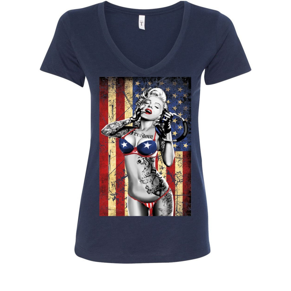 SEXY MARILYN MONROE US FLAG marilyn monroe us flag women's v-neck t-shirt freedom sexy girl tattoos gangsta navy blue
