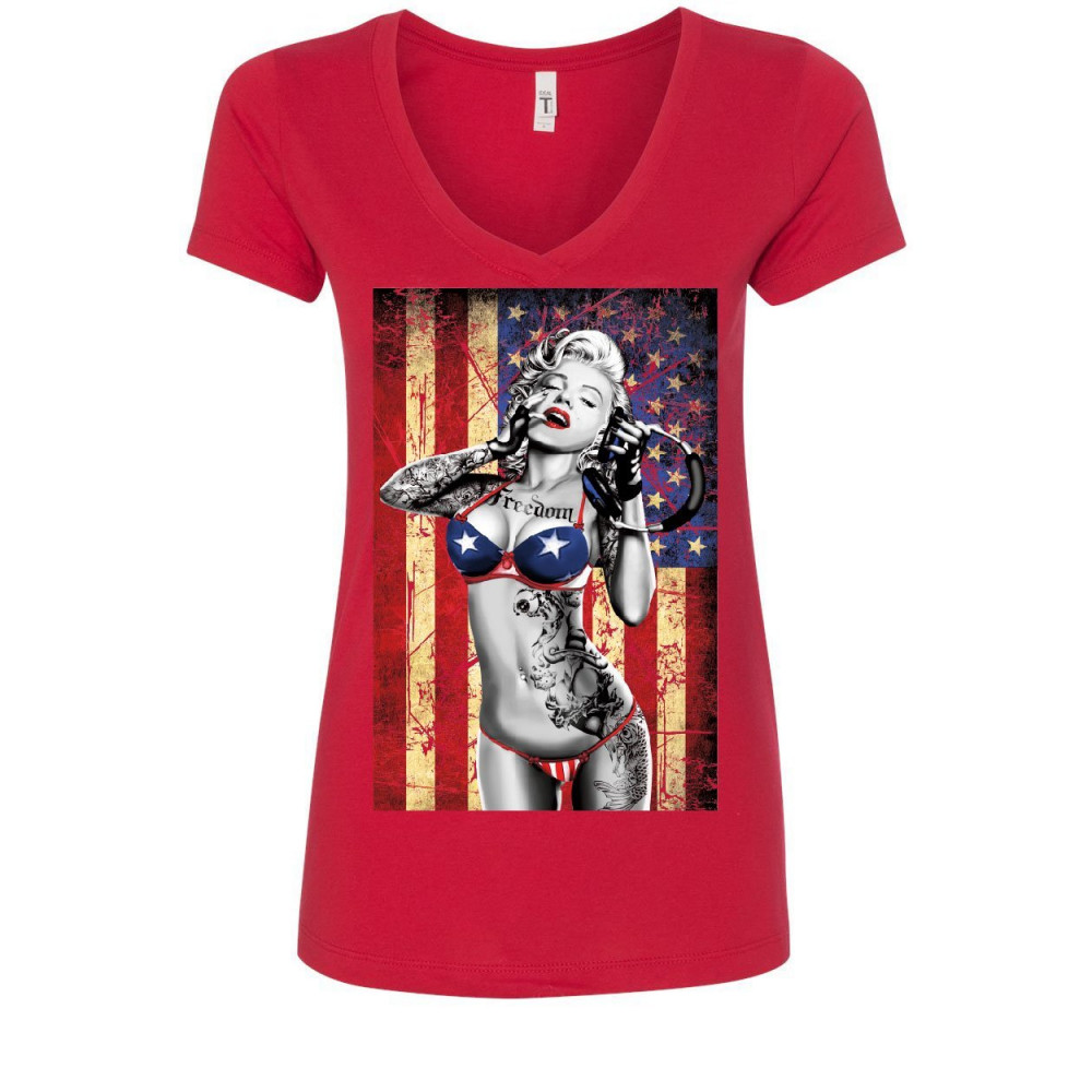 SEXY MARILYN MONROE US FLAG marilyn monroe us flag women's v-neck t-shirt freedom sexy girl tattoos gangsta red