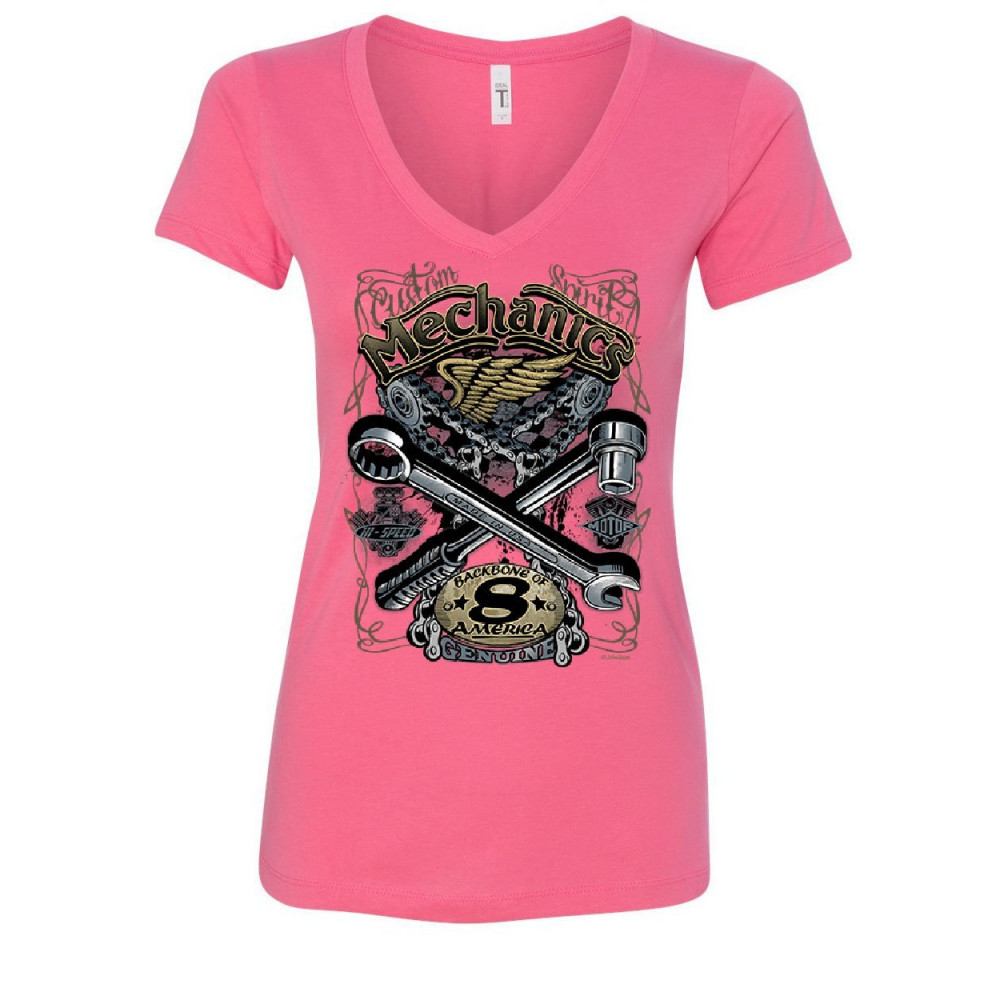 MECHANICS - BACKBONE OF AMERICA mechanics backbone of america women's v-neck t-shirt engine repair blue collar pink