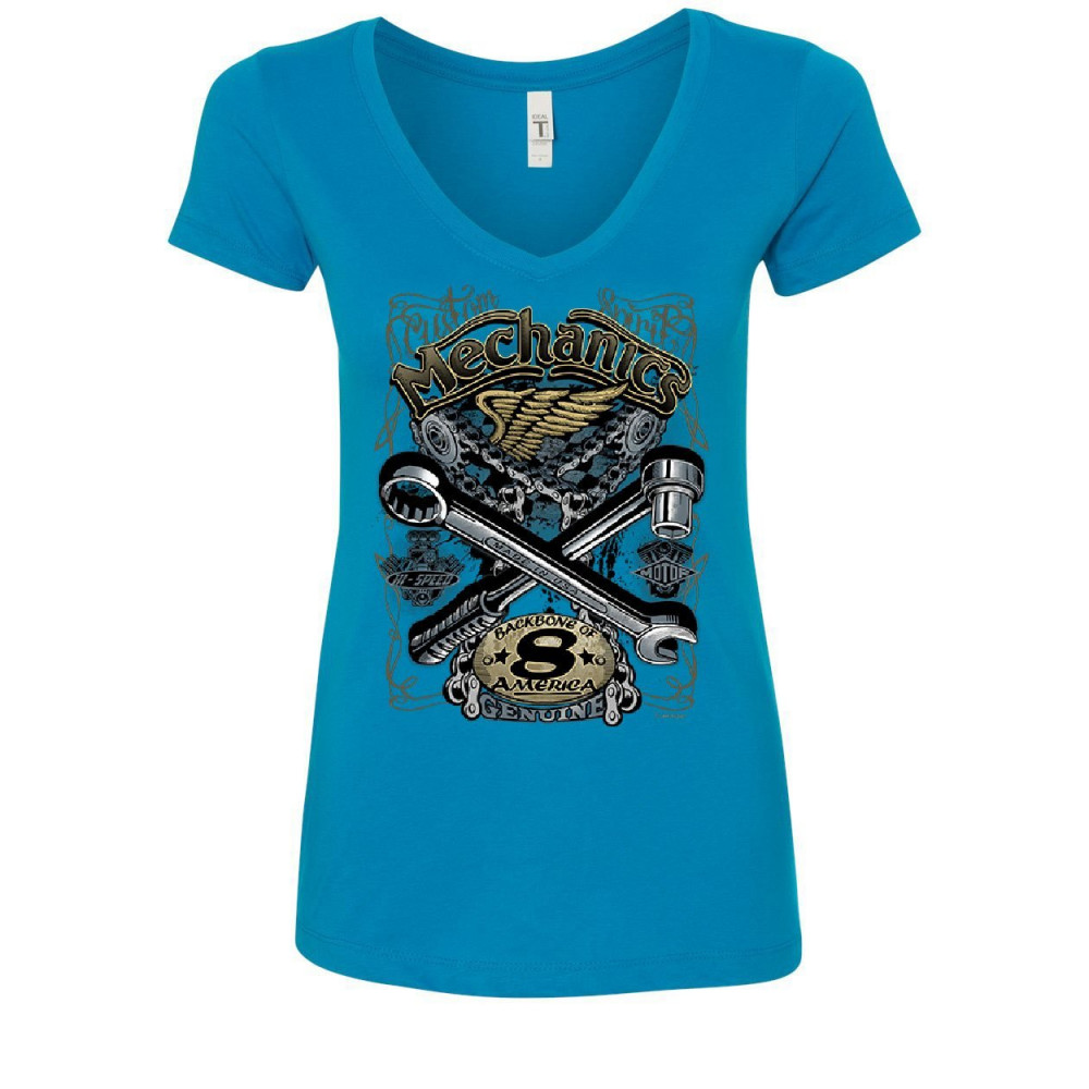 MECHANICS - BACKBONE OF AMERICA mechanics backbone of america women's v-neck t-shirt engine repair blue collar turquoise