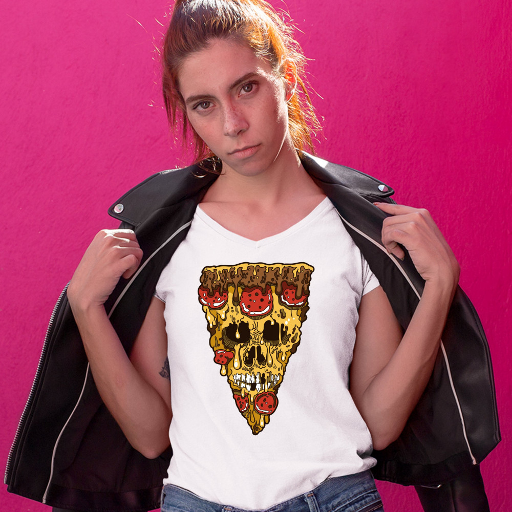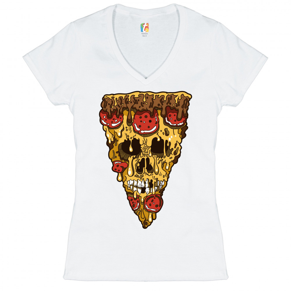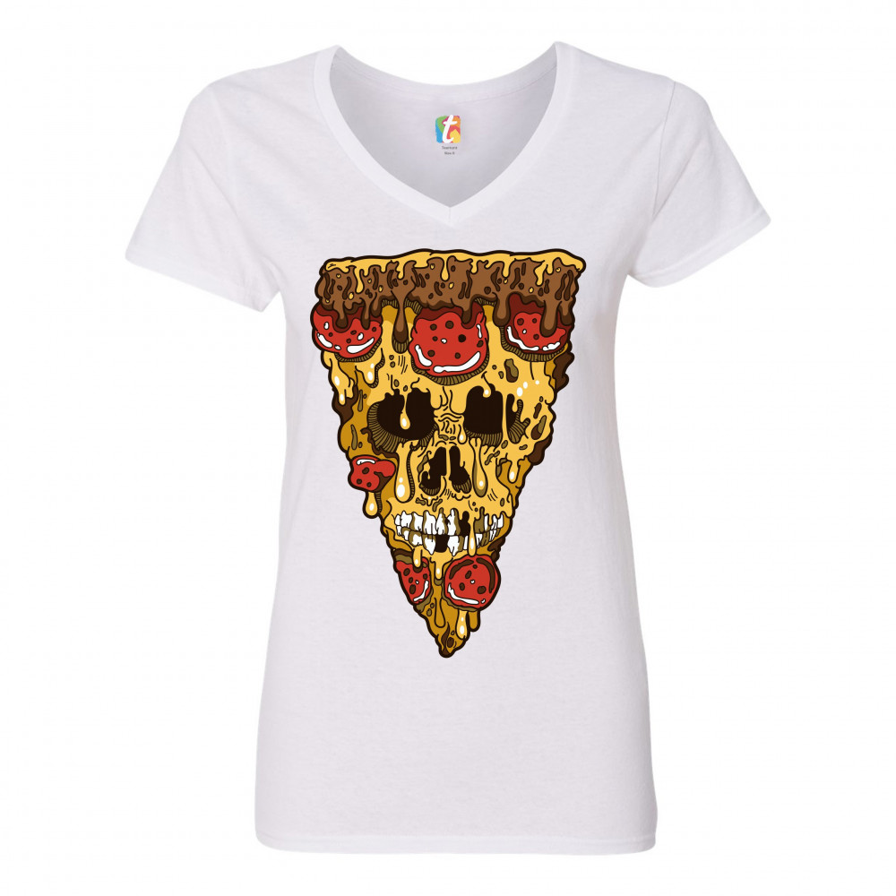MELTING PIZZA ZOMBIE FACE women's v-neck t-shirt horror halloween undead tee white
