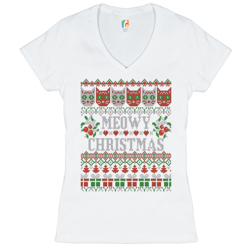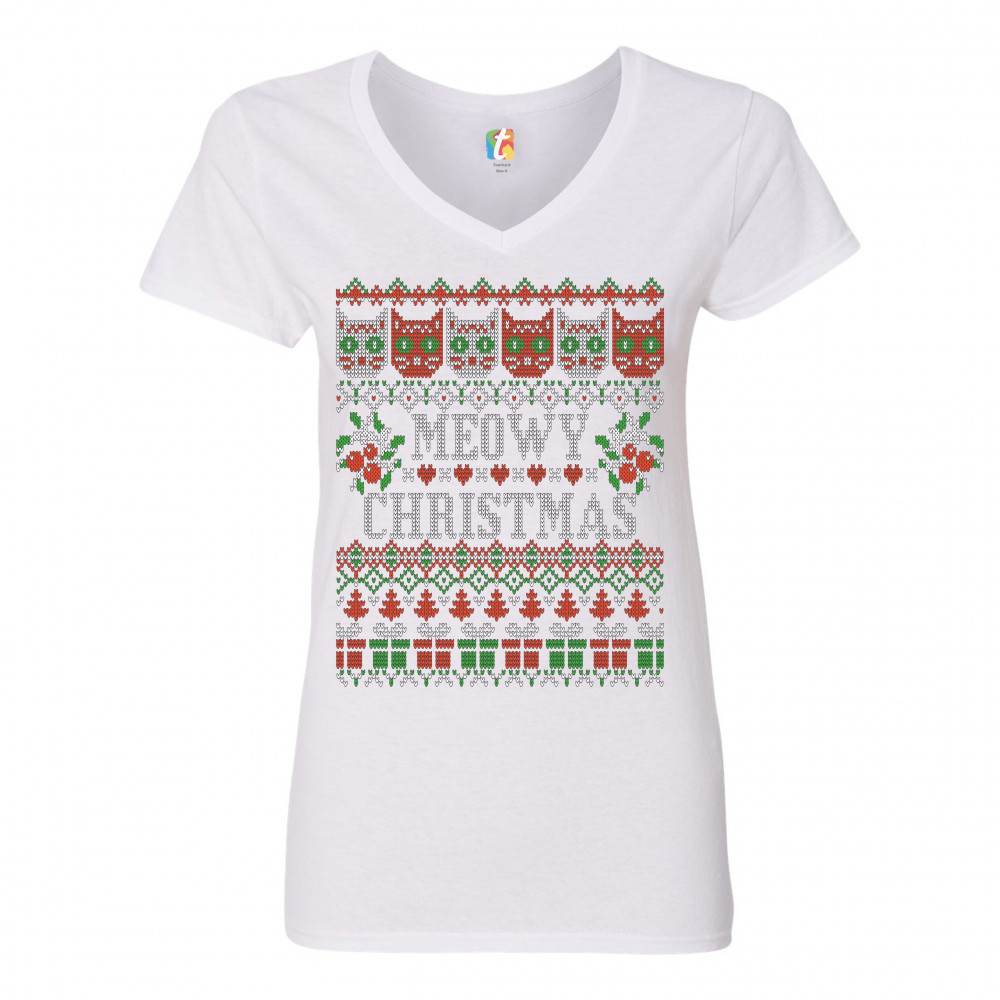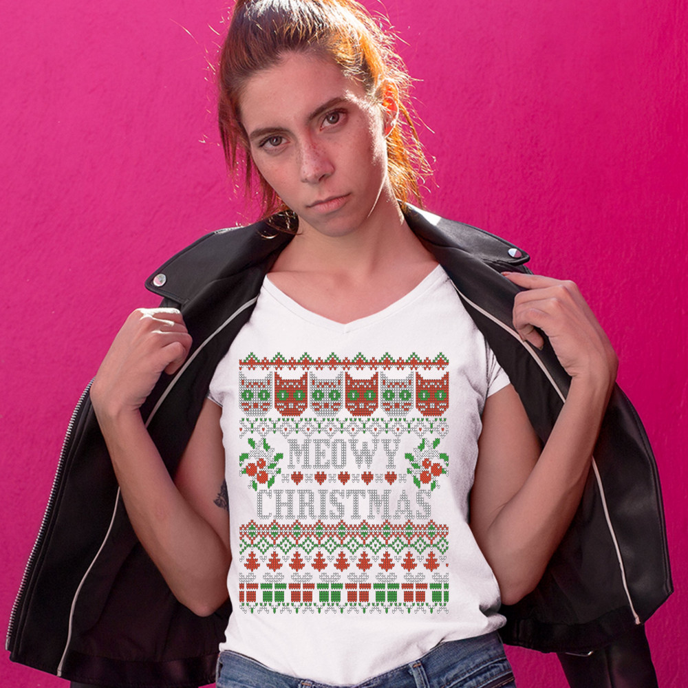 MEOWY CHRISTMAS women's v-neck t-shirt ugly sweater cat lover funny xmas tee white