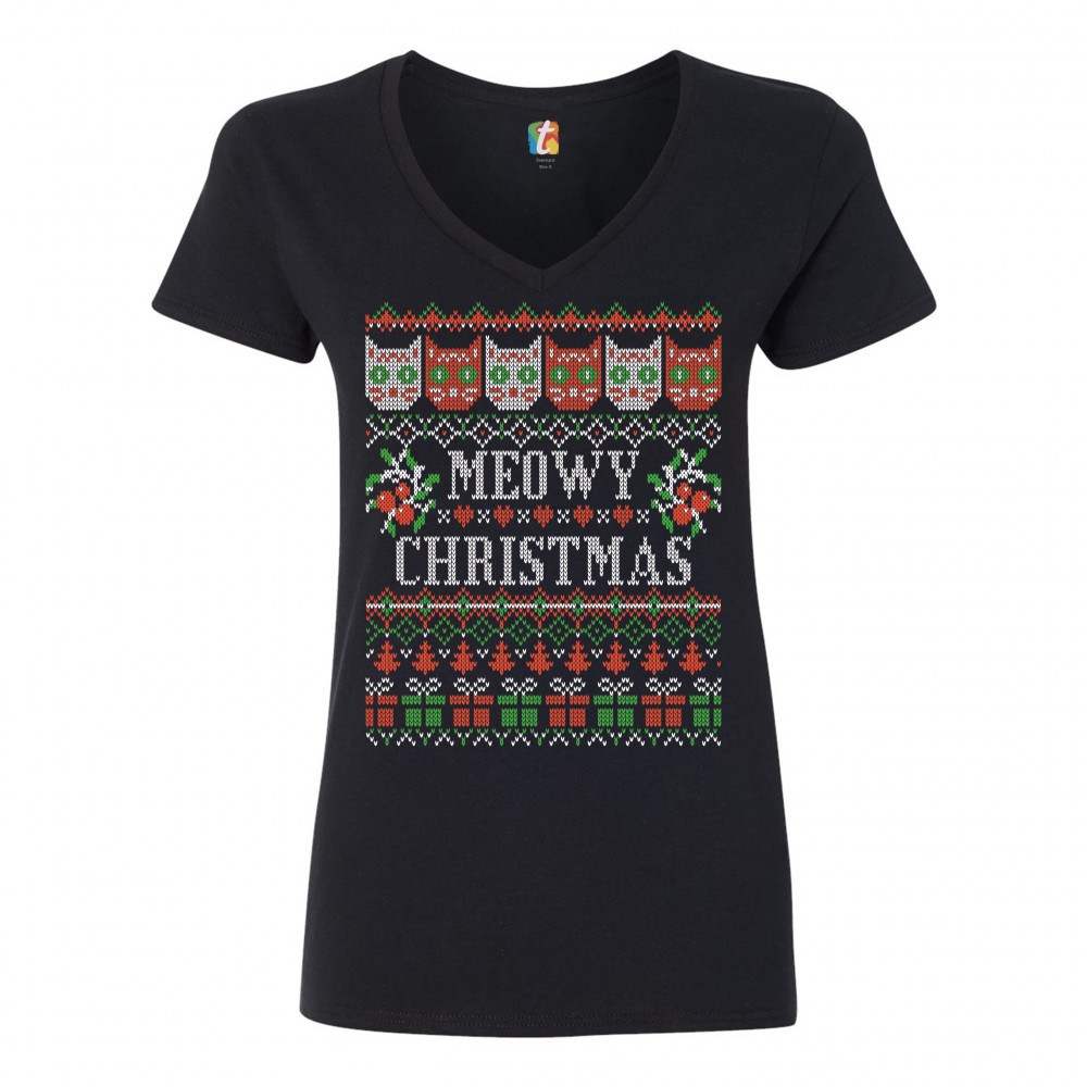 MEOWY CHRISTMAS women's v-neck t-shirt ugly sweater cat lover funny xmas tee black