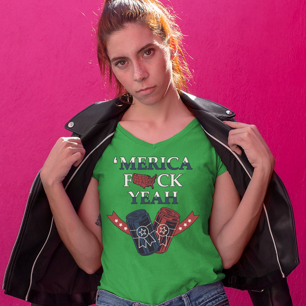 MERICA F*CK YEAH women's v-neck t-shirt patriotic american pride beer tee green