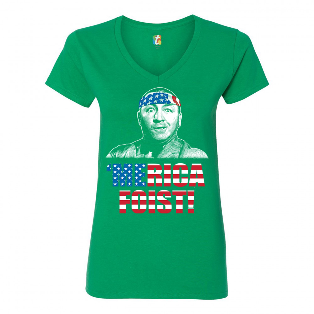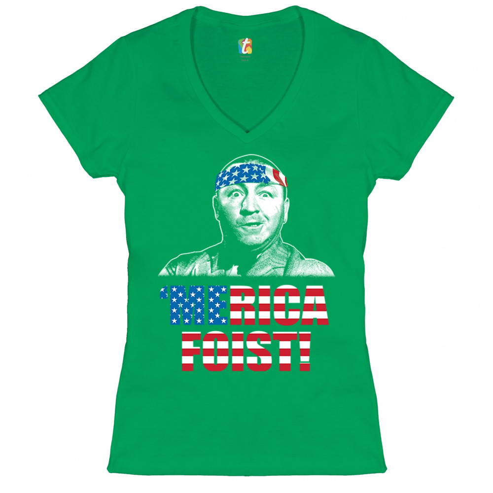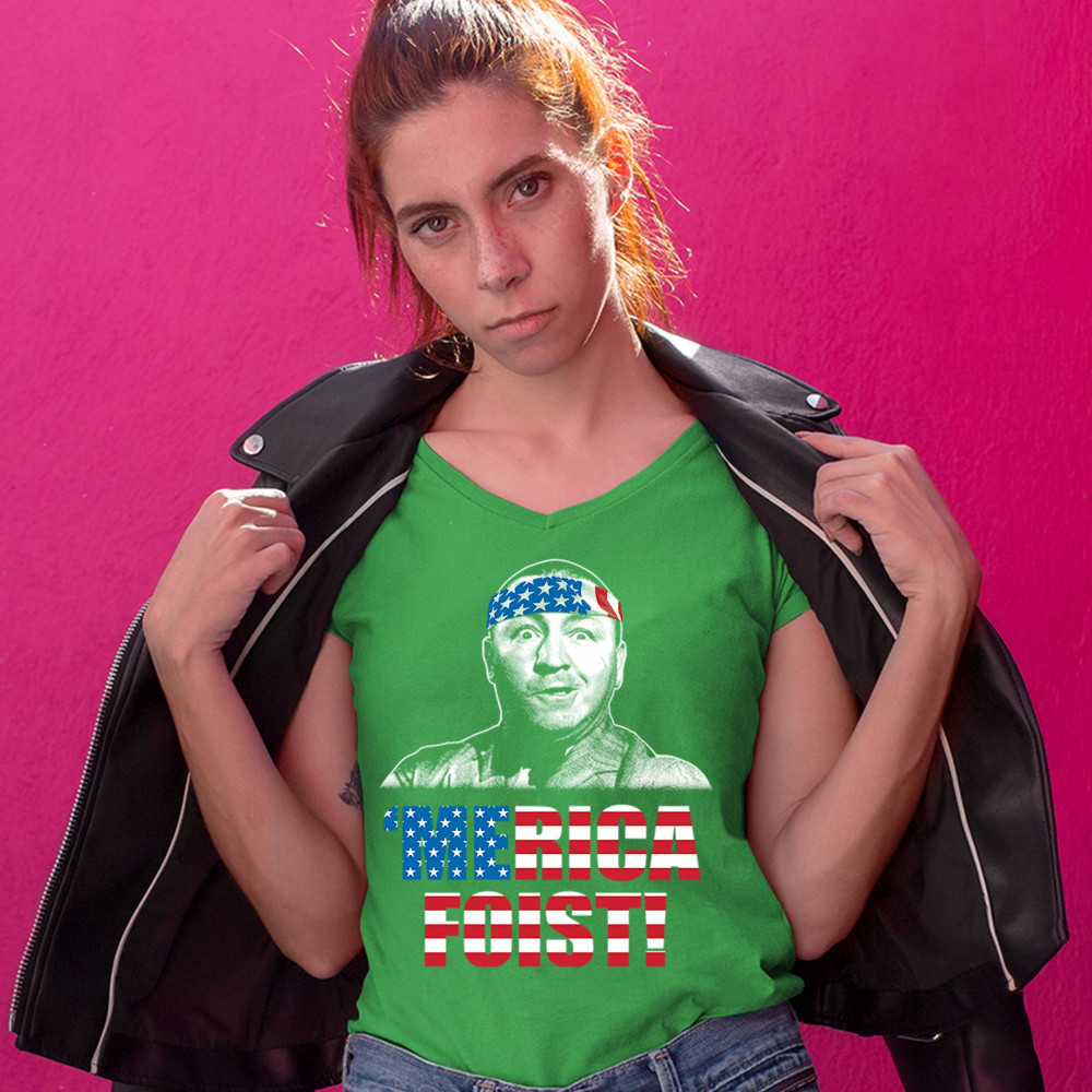 A funny patriotic print saying: "'Merica Foist" and depicting grinning Curly Howard wearing an American flag bandana. The words are decorated with the Stars and Stripes of the American flag. A great gift for anyone who is a fan of the legendary TV show.