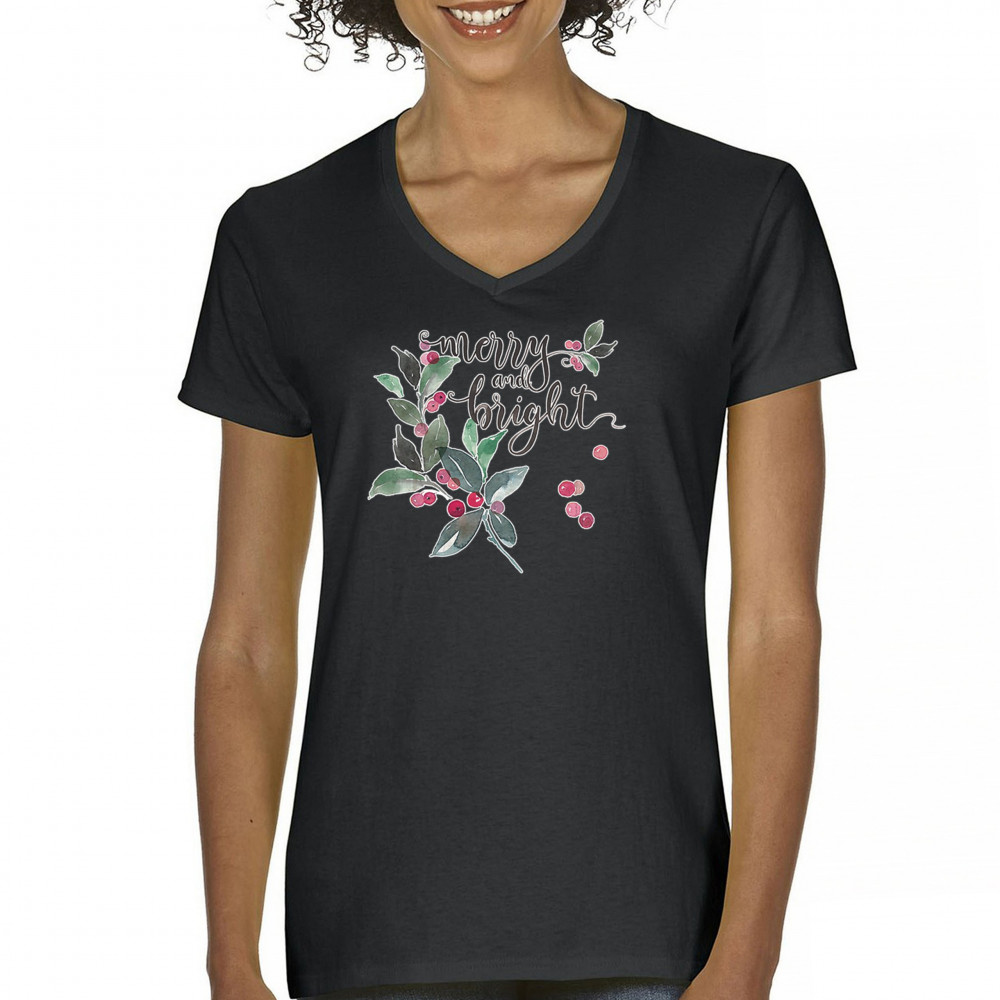 MERRY AND BRIGHT CUTE CHRISTMAS women's v-neck t-shirt jolly santa xmas tee black
