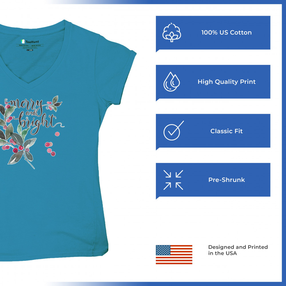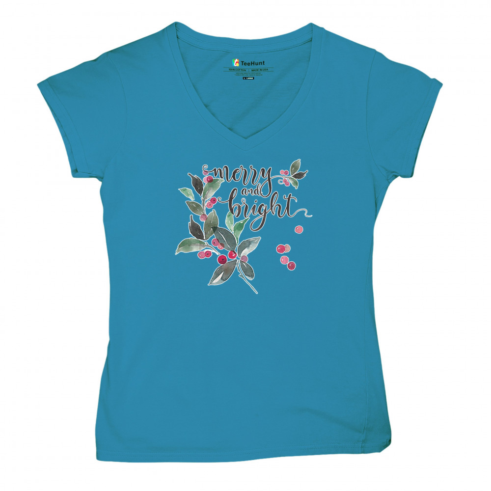 MERRY AND BRIGHT CUTE CHRISTMAS women's v-neck t-shirt jolly santa xmas tee turquoise