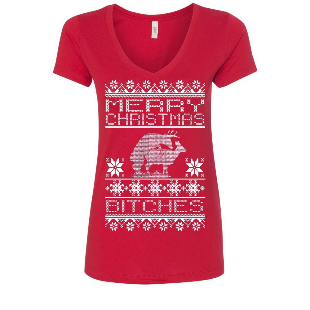 MERRY CHRISTMAS BITCHES women's v-neck t-shirt deer humping ugly sweatshirt red