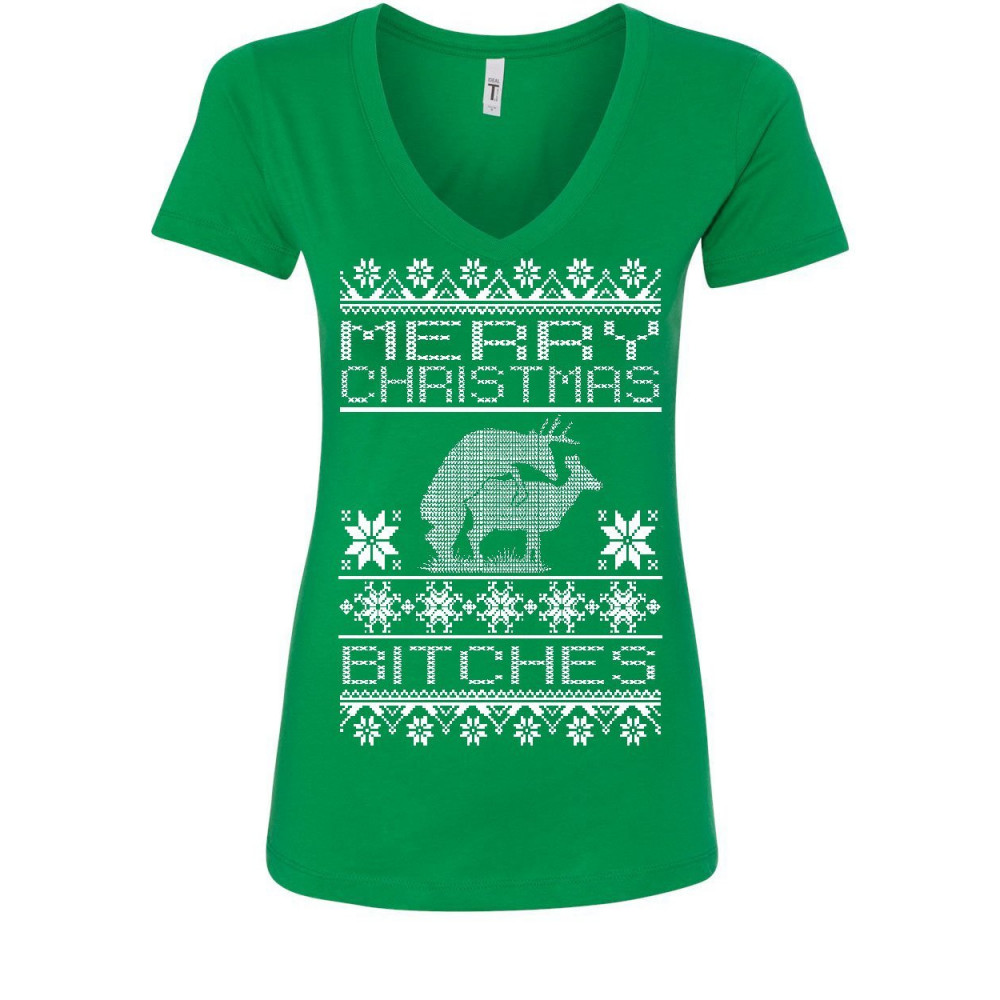 MERRY CHRISTMAS BITCHES women's v-neck t-shirt deer humping ugly sweatshirt green