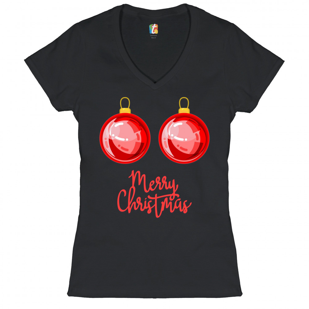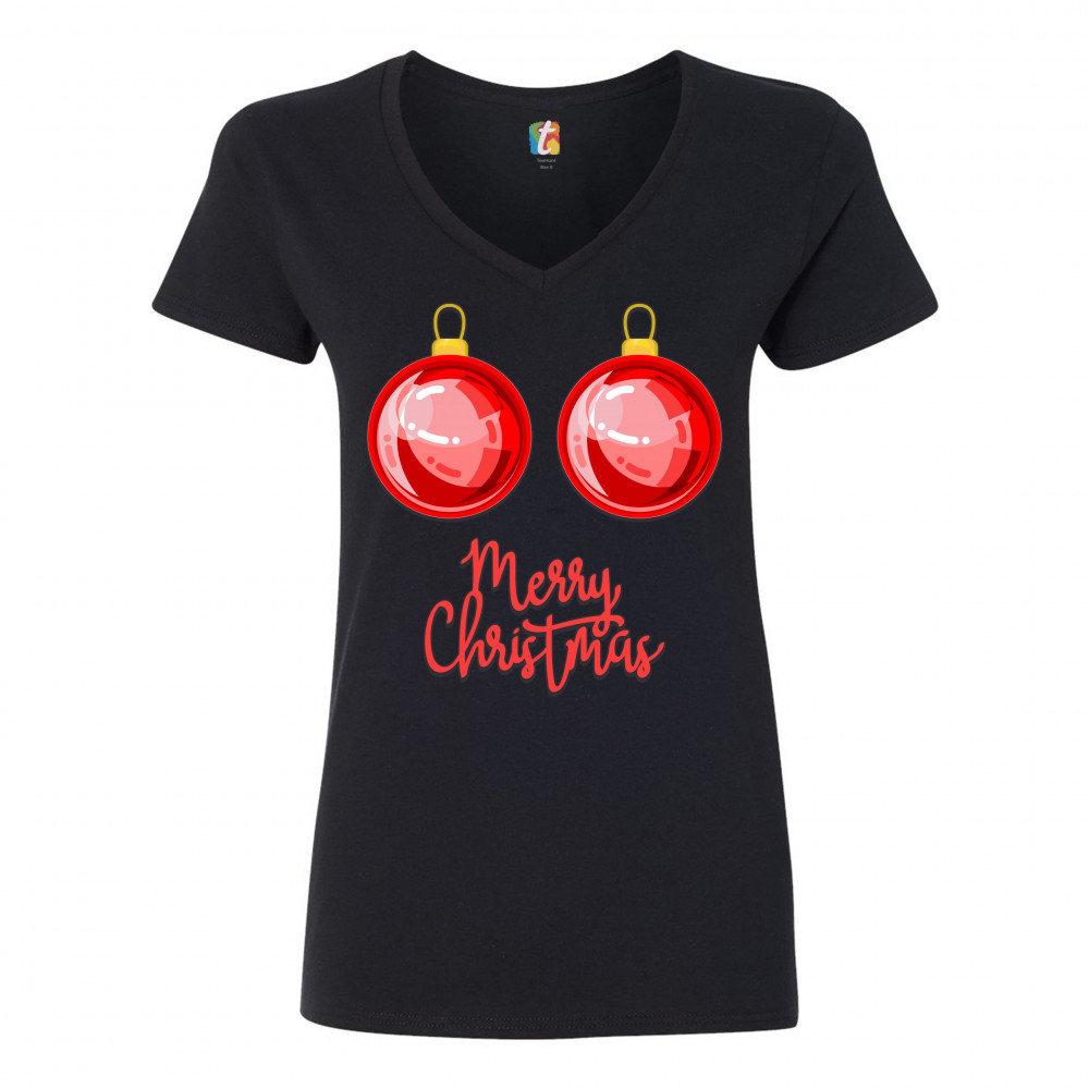 MERRY CHRISTMAS BOOBS women's v-neck t-shirt naughty or nice funny tits tee black