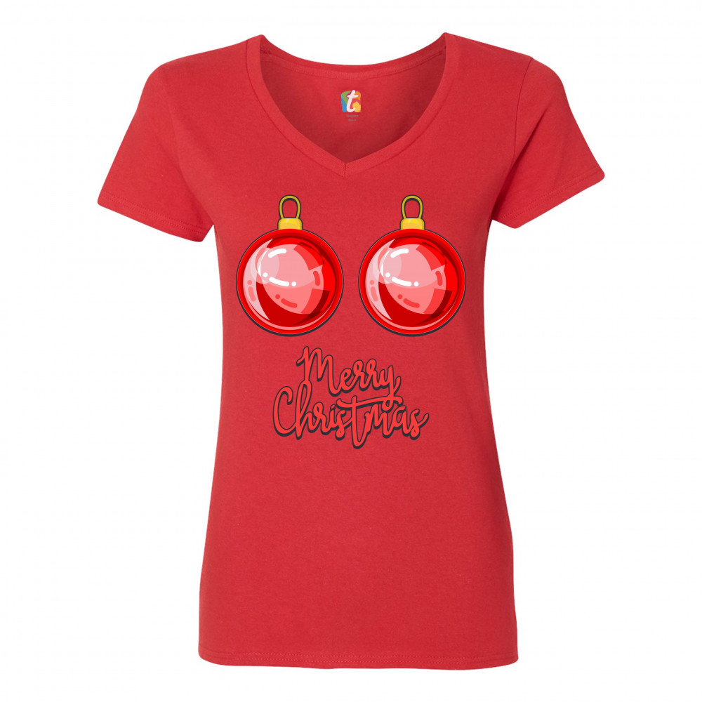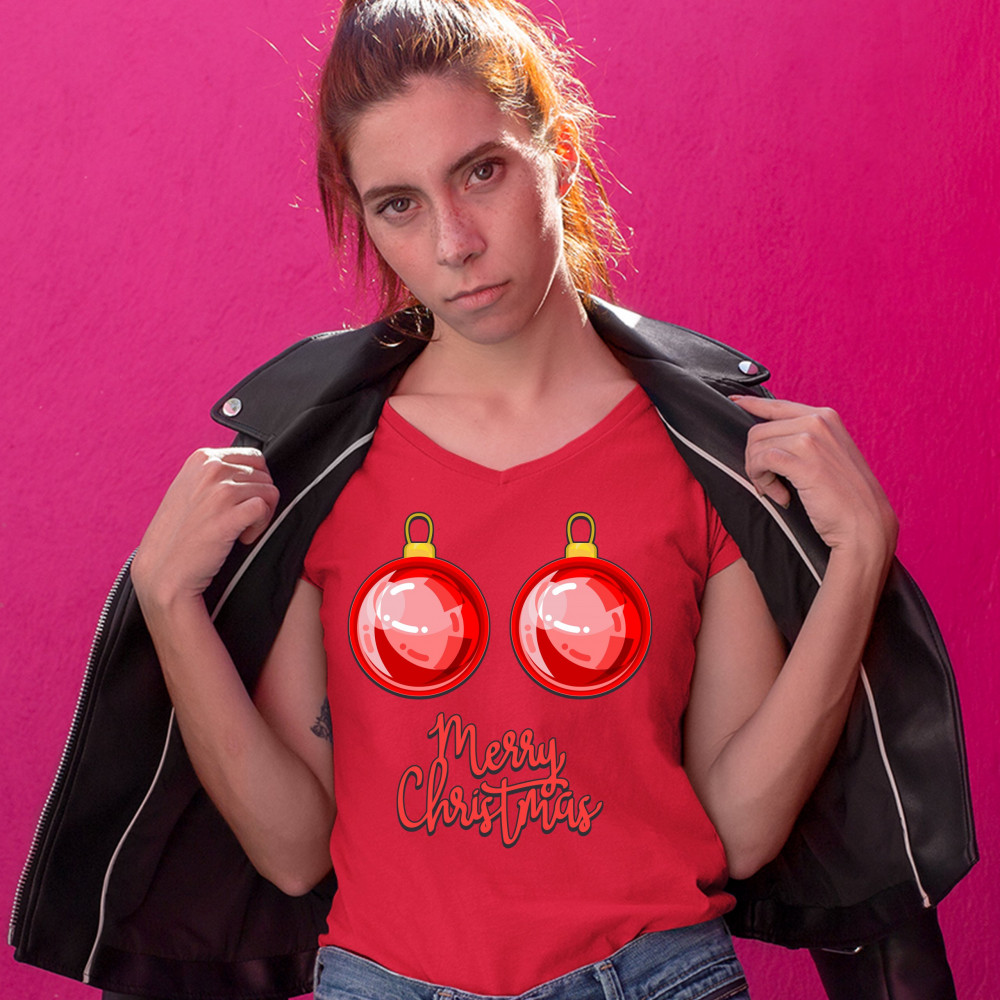 MERRY CHRISTMAS BOOBS women's v-neck t-shirt naughty or nice funny tits tee red