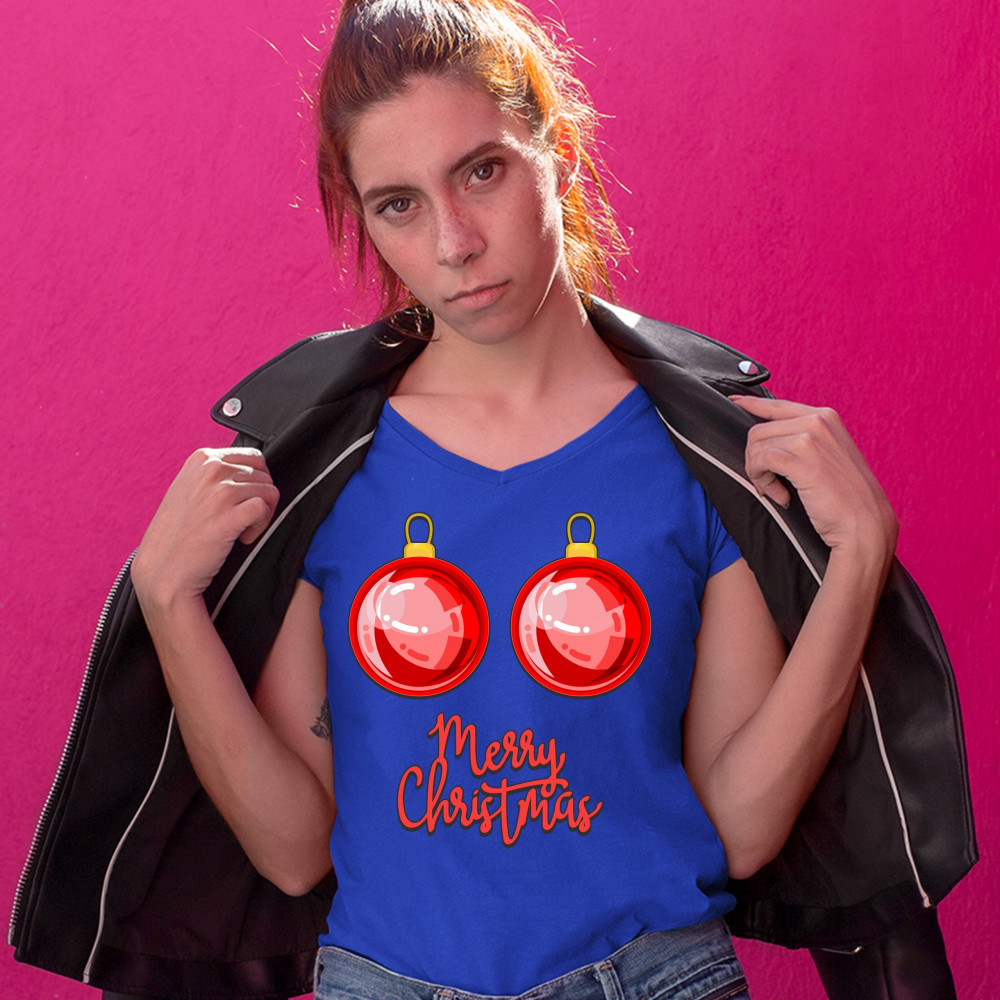 MERRY CHRISTMAS BOOBS women's v-neck t-shirt naughty or nice funny tits tee royal blue