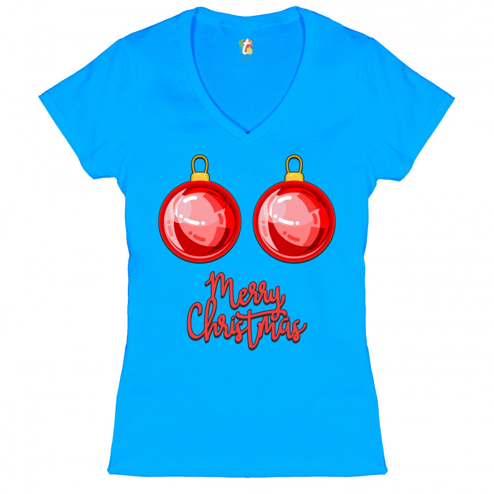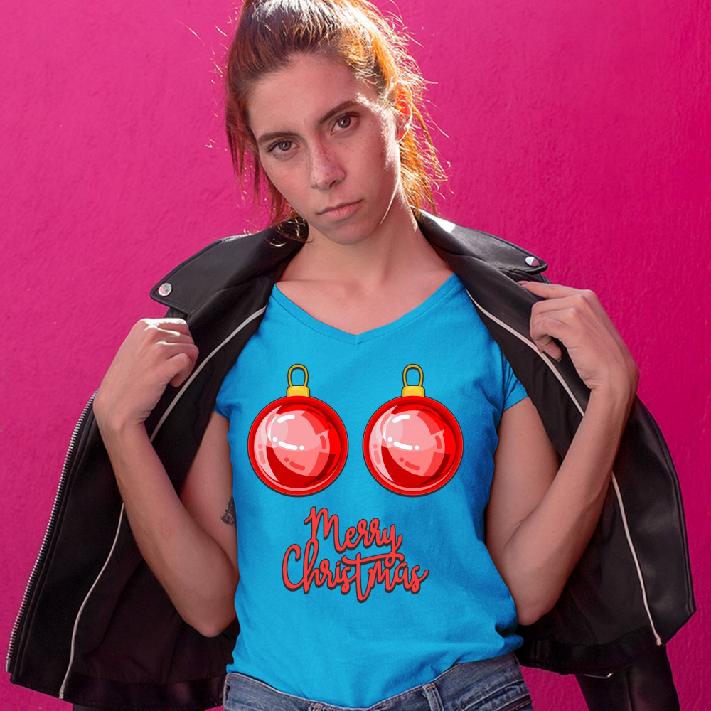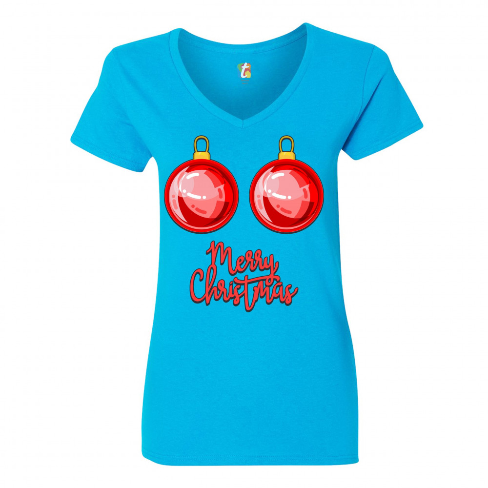 MERRY CHRISTMAS BOOBS women's v-neck t-shirt naughty or nice funny tits tee turquoise