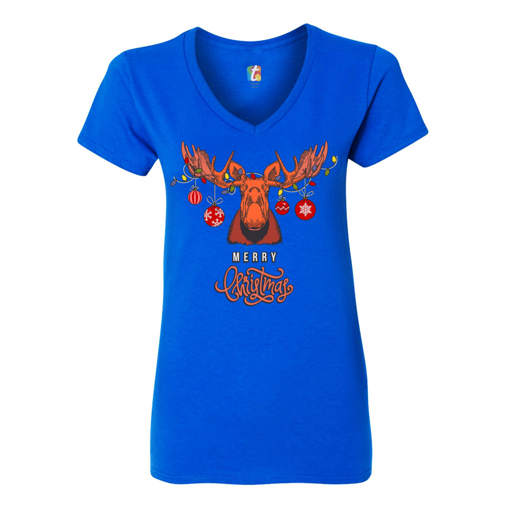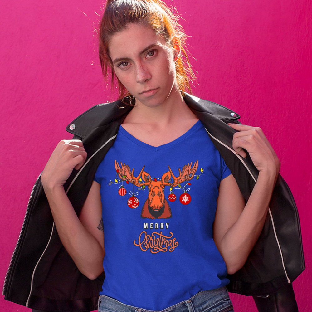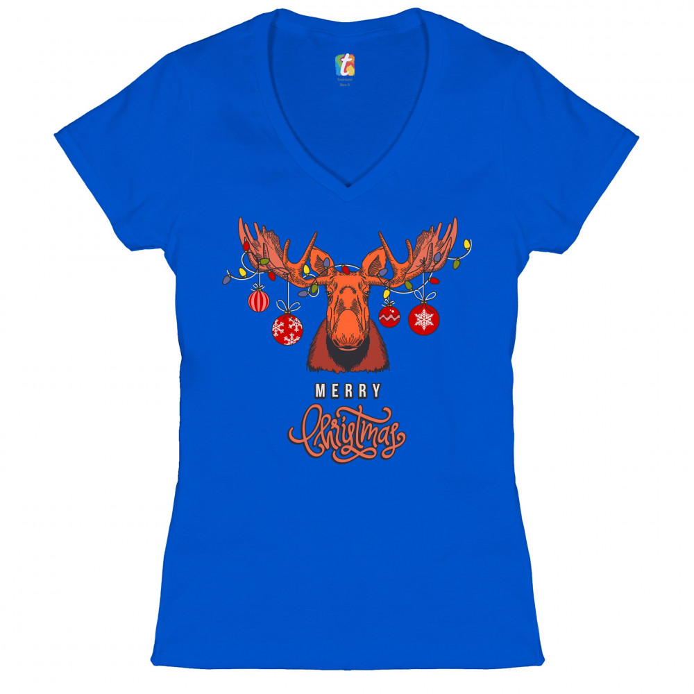 MERRY CHRISTMAS BUCK women's v-neck t-shirt reindeer rudolph holiday tee royal blue