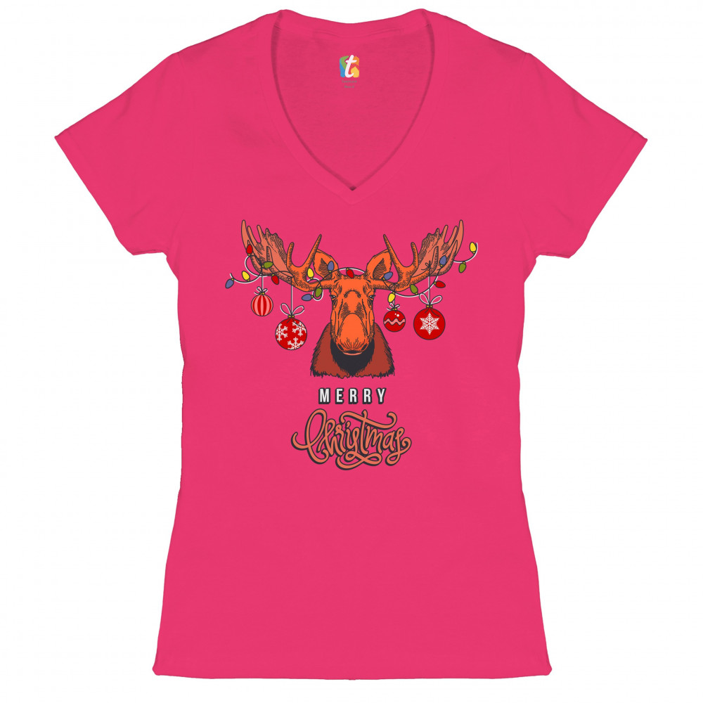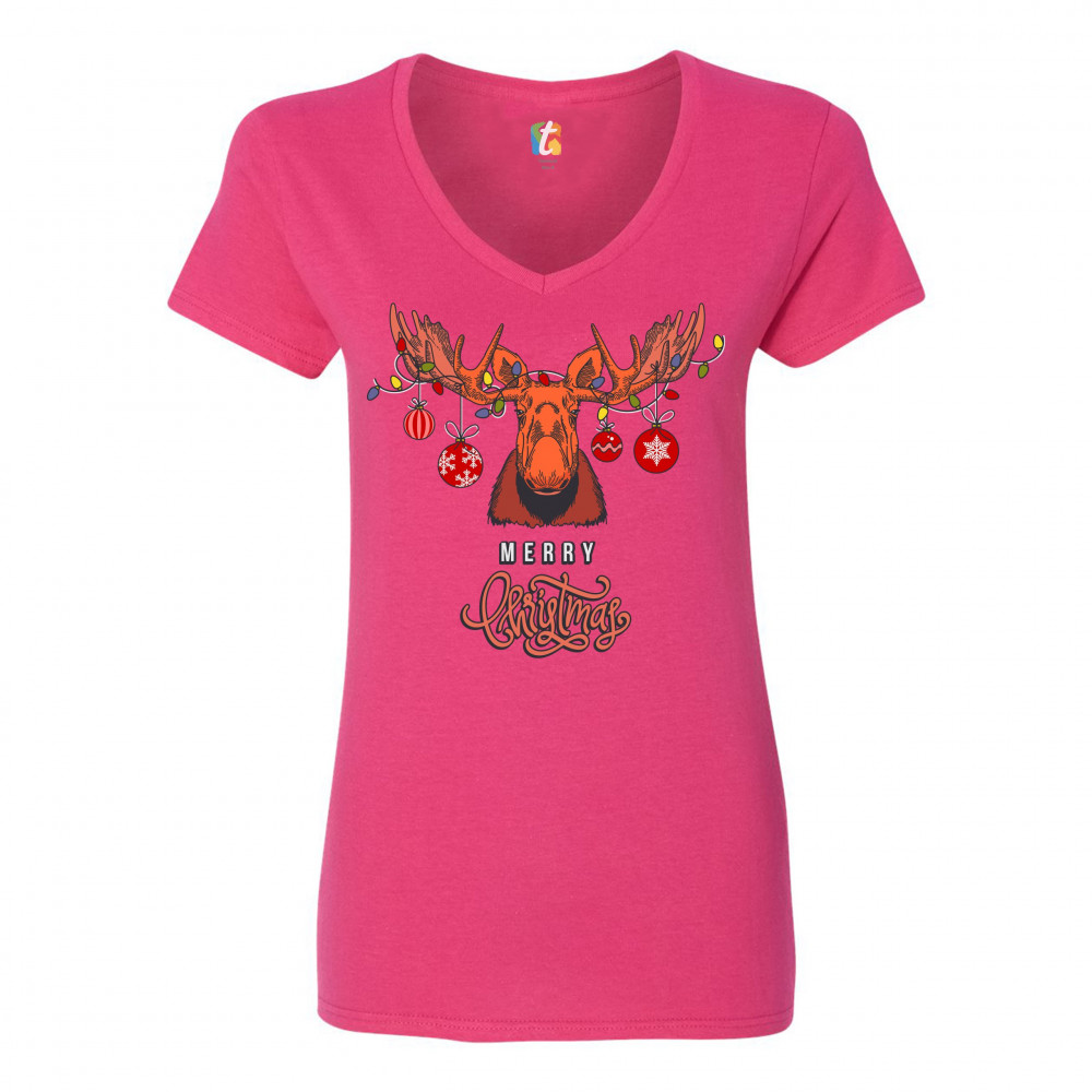 MERRY CHRISTMAS BUCK women's v-neck t-shirt reindeer rudolph holiday tee pink