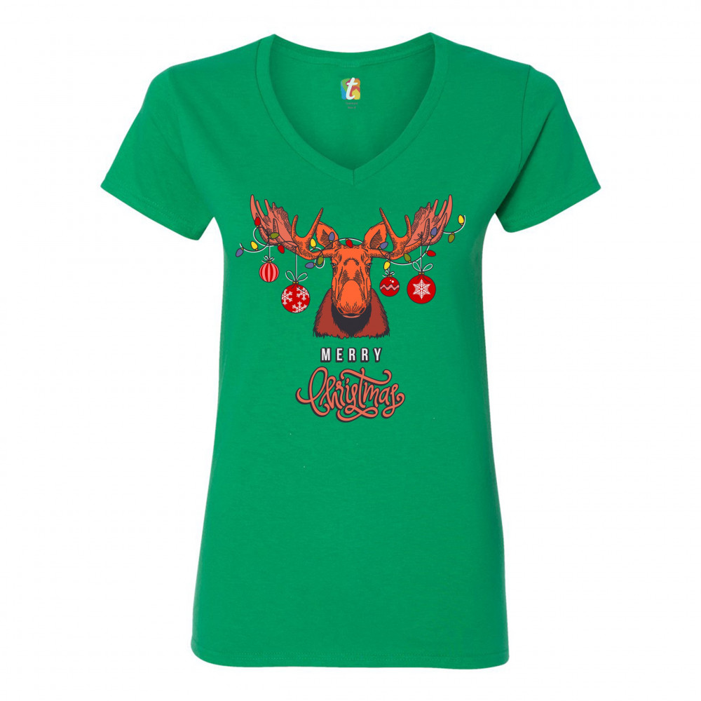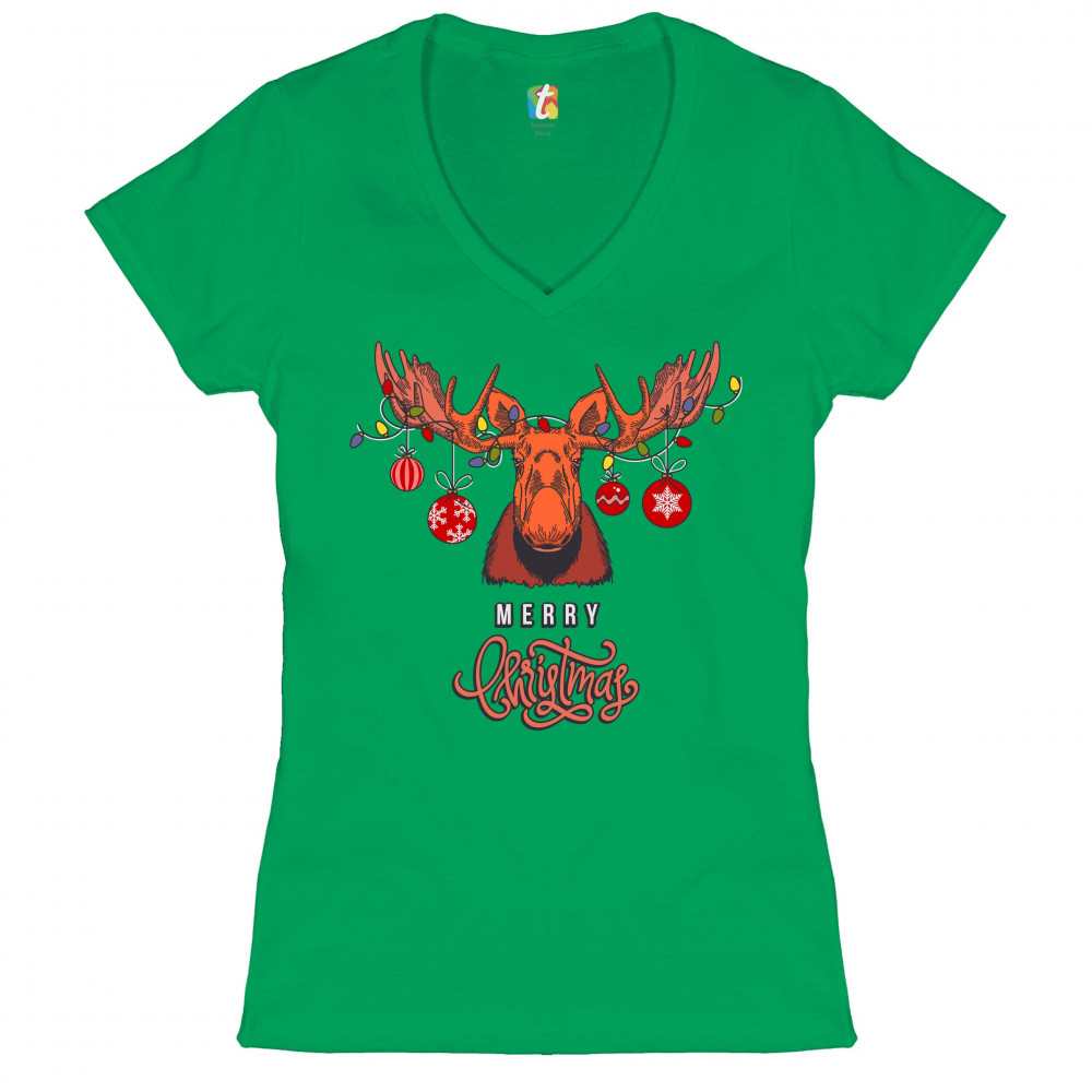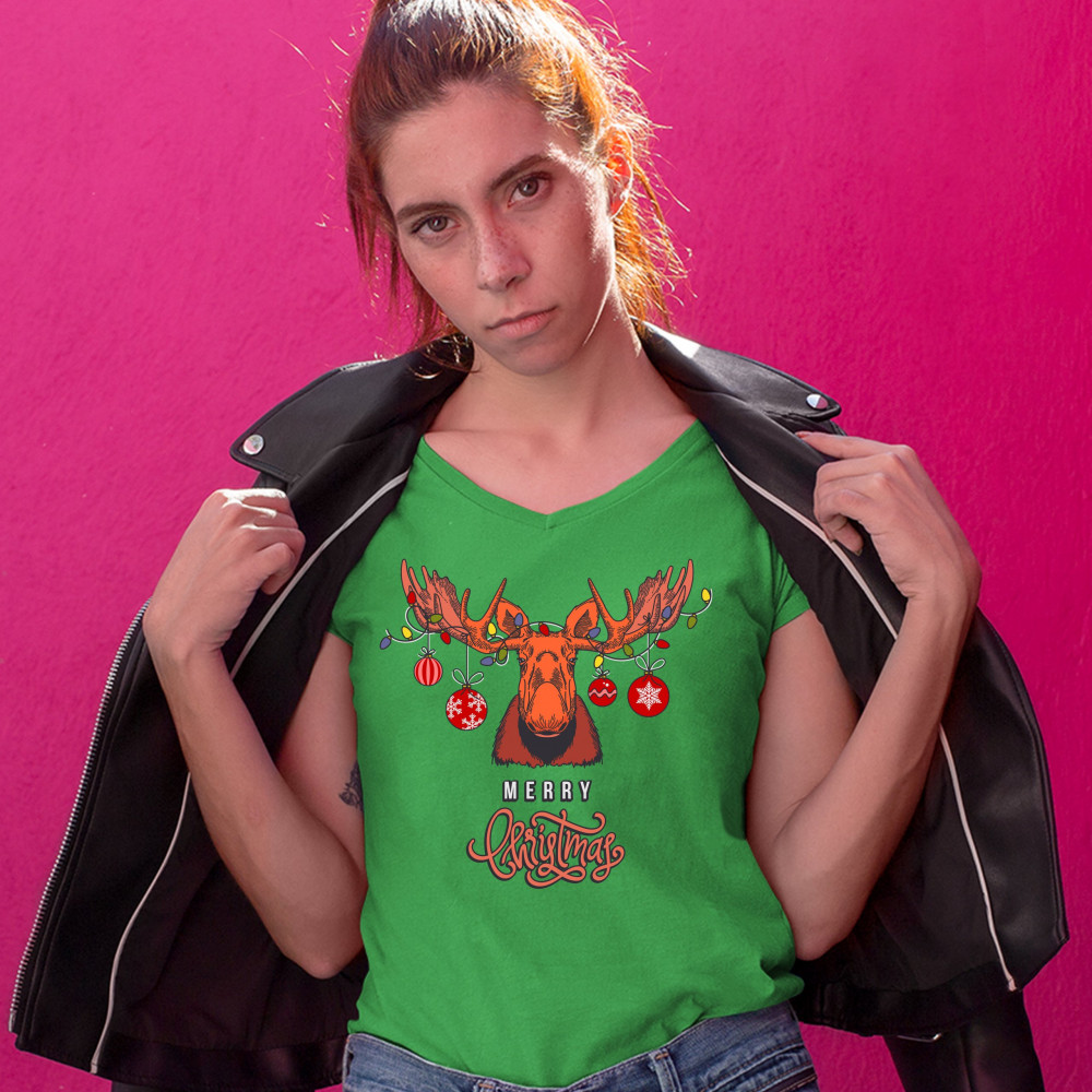 MERRY CHRISTMAS BUCK women's v-neck t-shirt reindeer rudolph holiday tee green