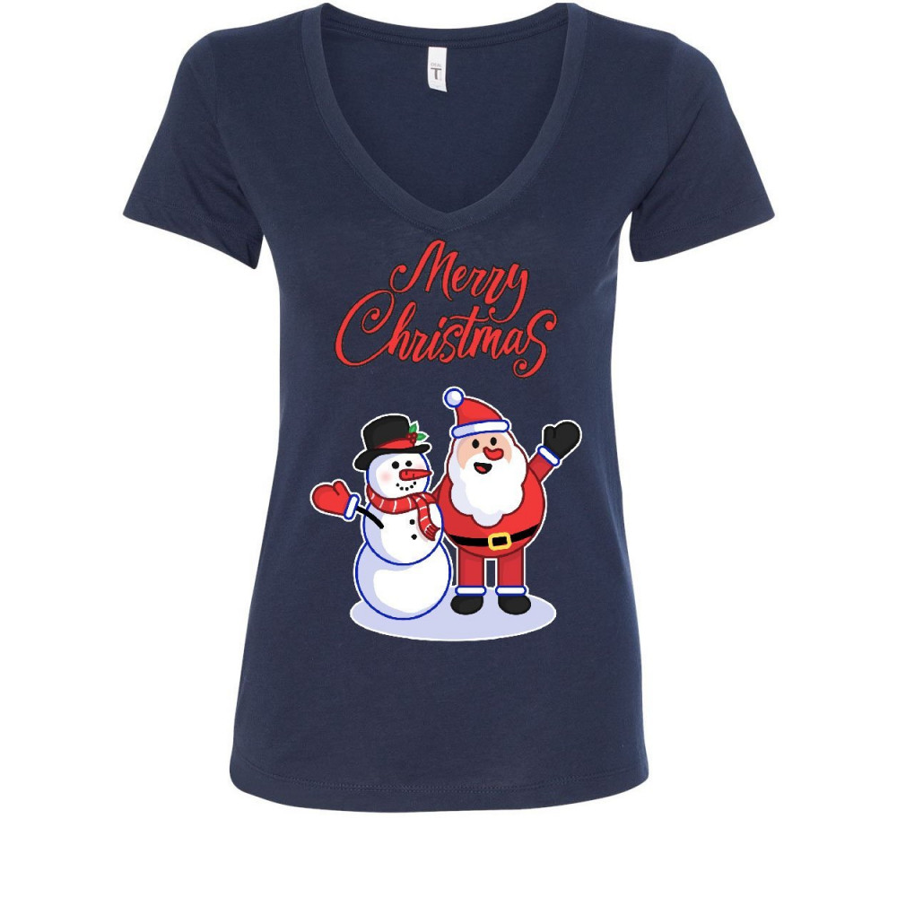 MERRY CHRISTMAS SANTA AND SNOWMAN merry christmas santa snowman hug women's v-neck t-shirt xmas holiday spirit navy blue
