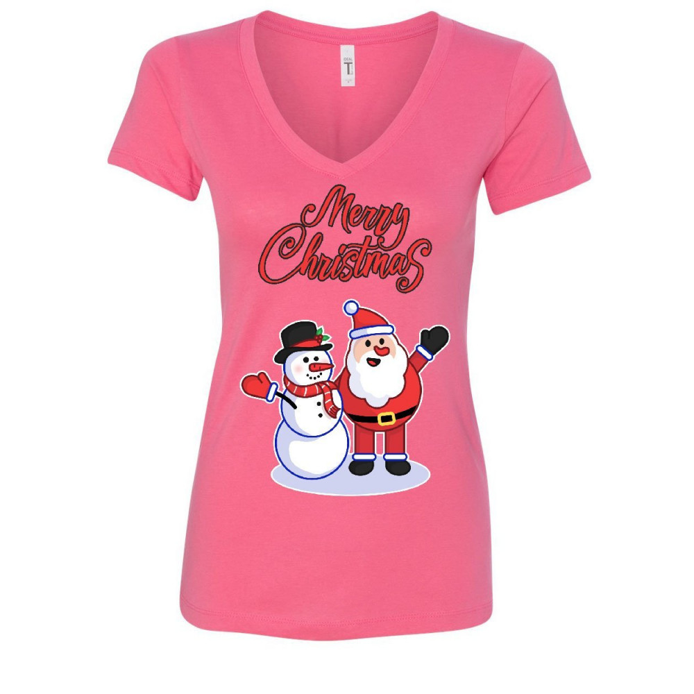 MERRY CHRISTMAS SANTA AND SNOWMAN merry christmas santa snowman hug women's v-neck t-shirt xmas holiday spirit pink
