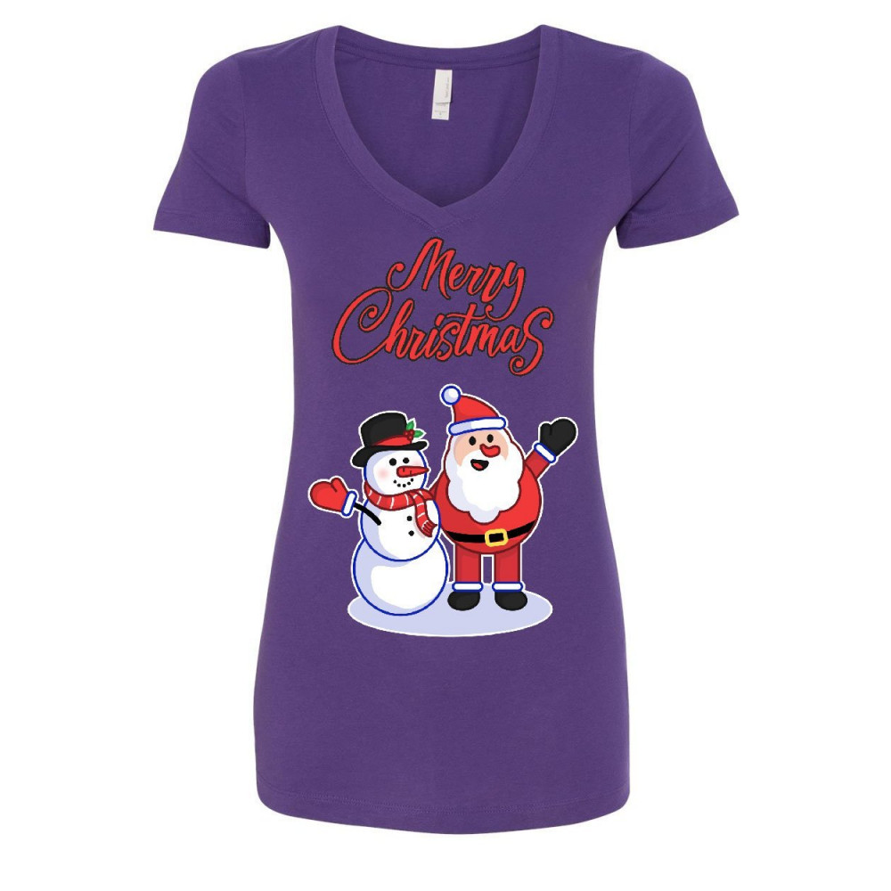 MERRY CHRISTMAS SANTA AND SNOWMAN merry christmas santa snowman hug women's v-neck t-shirt xmas holiday spirit purple
