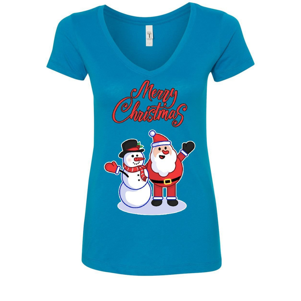 MERRY CHRISTMAS SANTA AND SNOWMAN merry christmas santa snowman hug women's v-neck t-shirt xmas holiday spirit turquoise