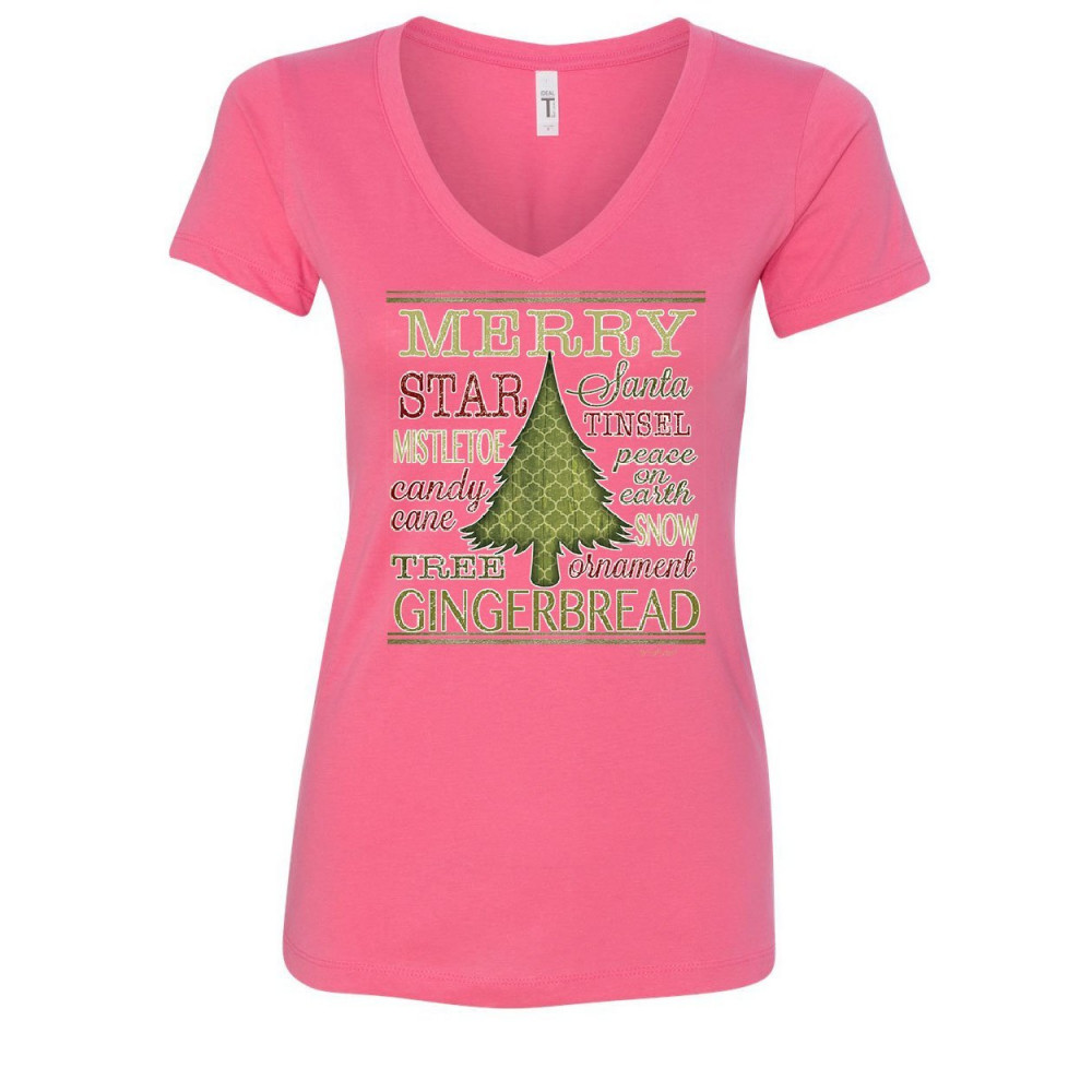 MERRY CHRISTMAS xmas tree women's v-neck t-shirt holiday spirit joy santa snow pink