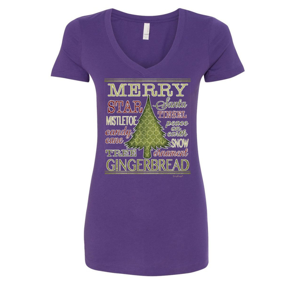 MERRY CHRISTMAS xmas tree women's v-neck t-shirt holiday spirit joy santa snow purple