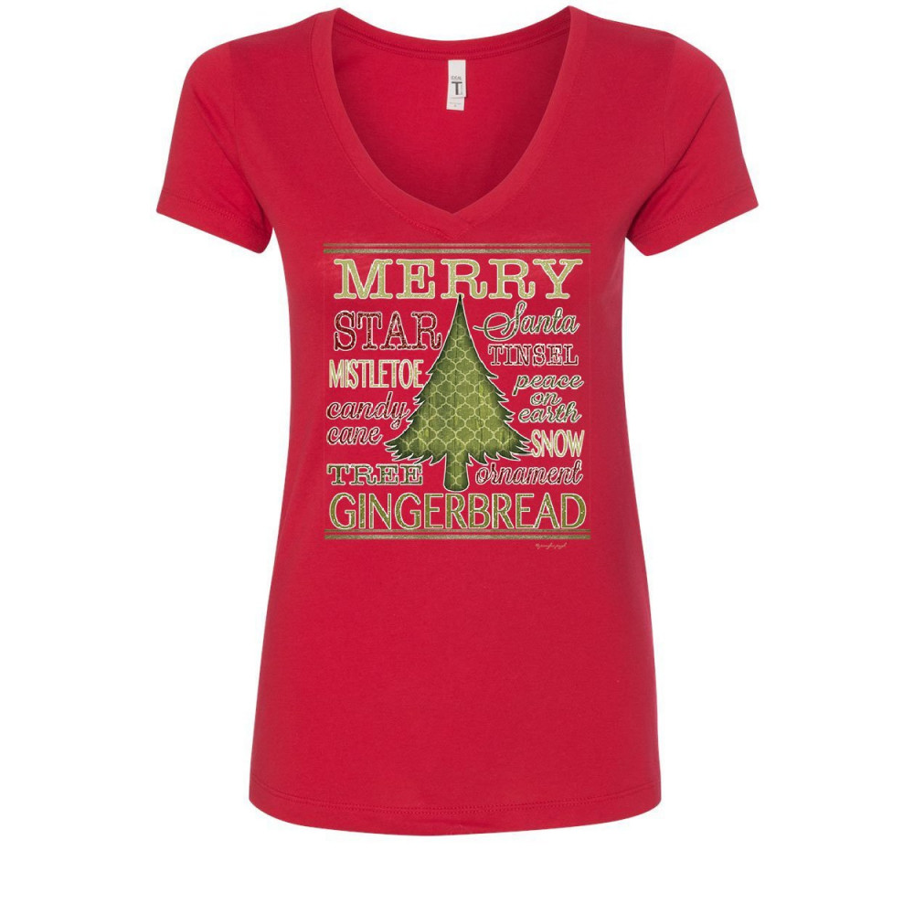 MERRY CHRISTMAS xmas tree women's v-neck t-shirt holiday spirit joy santa snow red