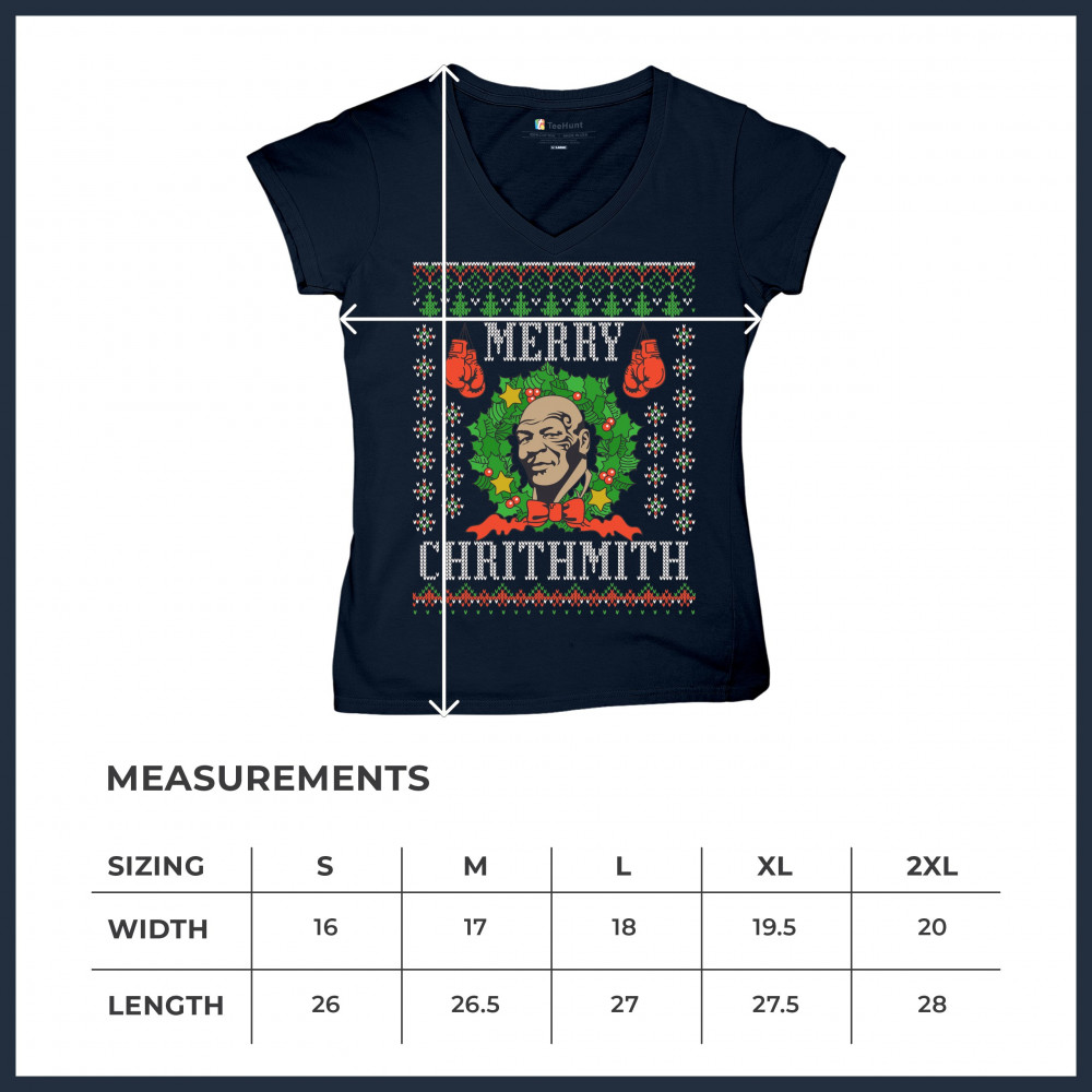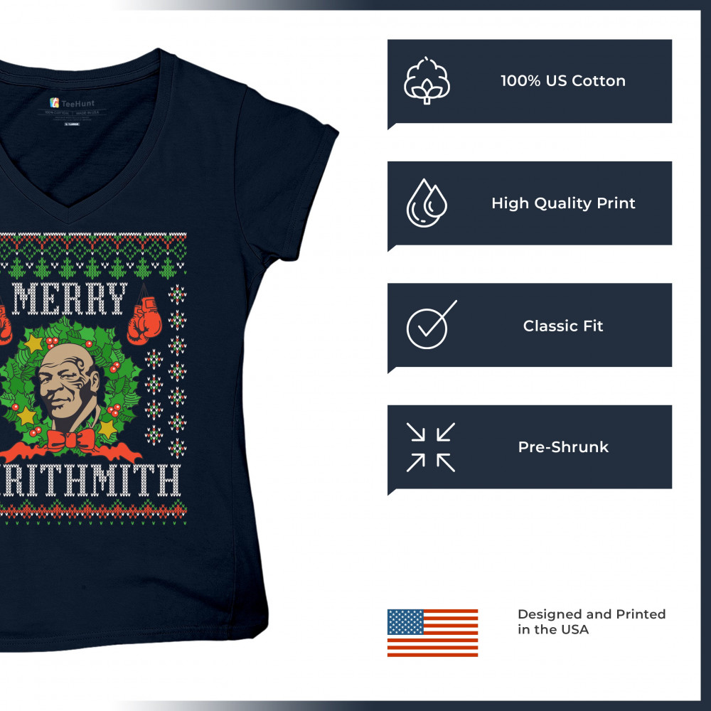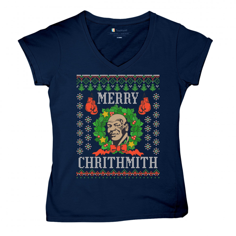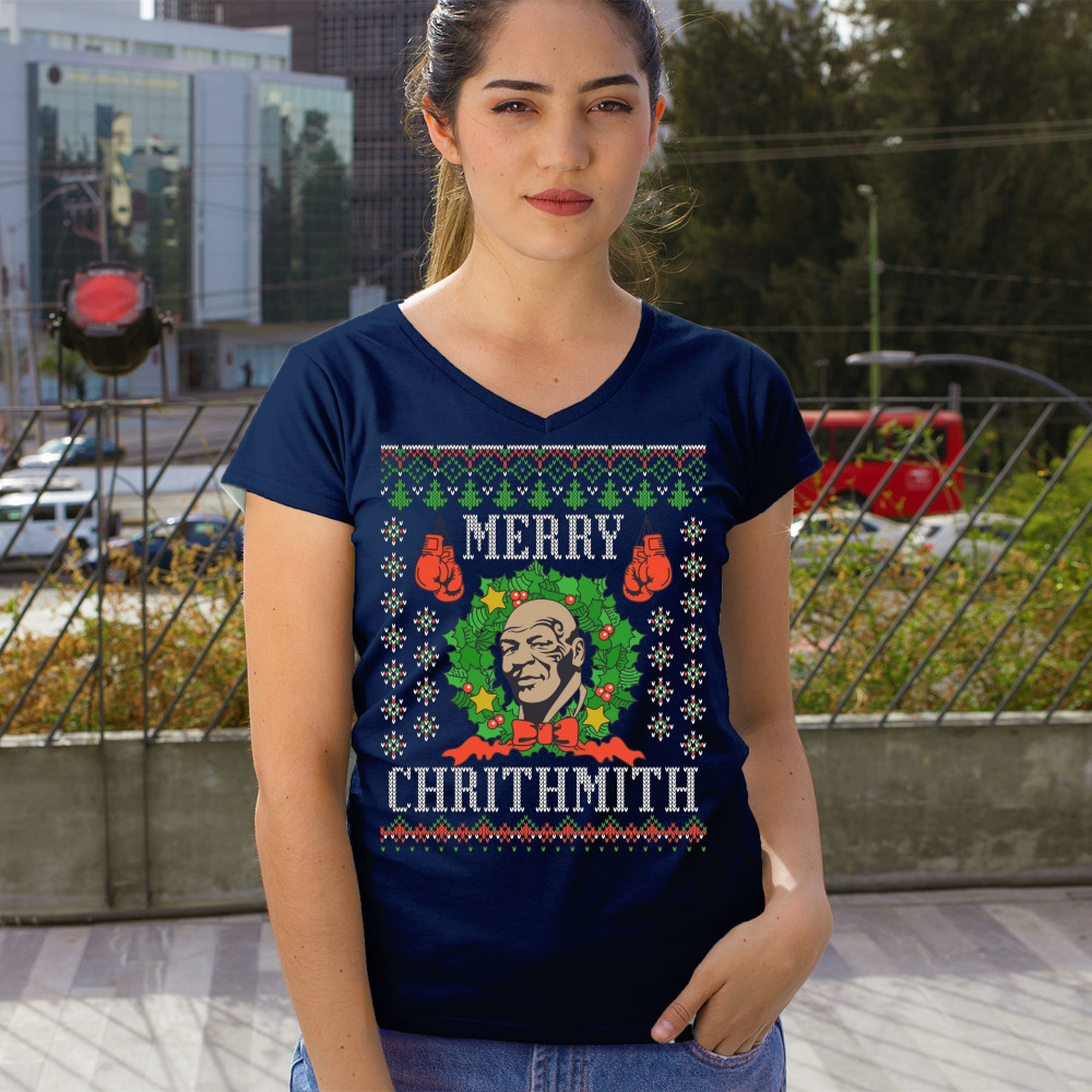 MERRY CHRITHMITH women's v-neck t-shirt mike tyson ugly sweater christmas tee navy blue