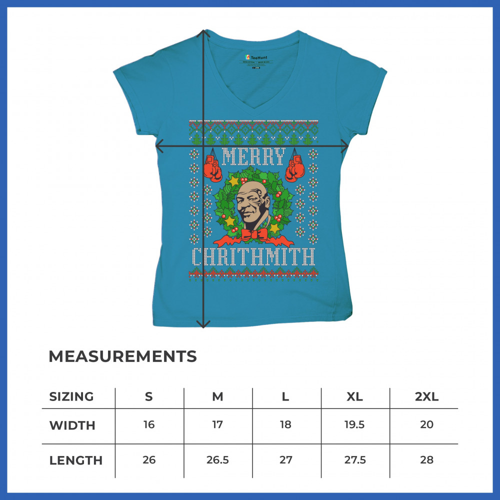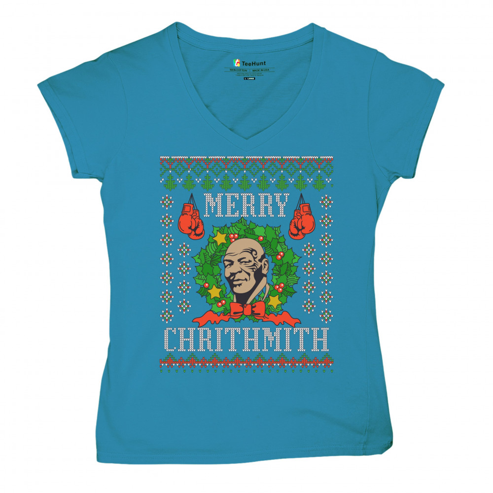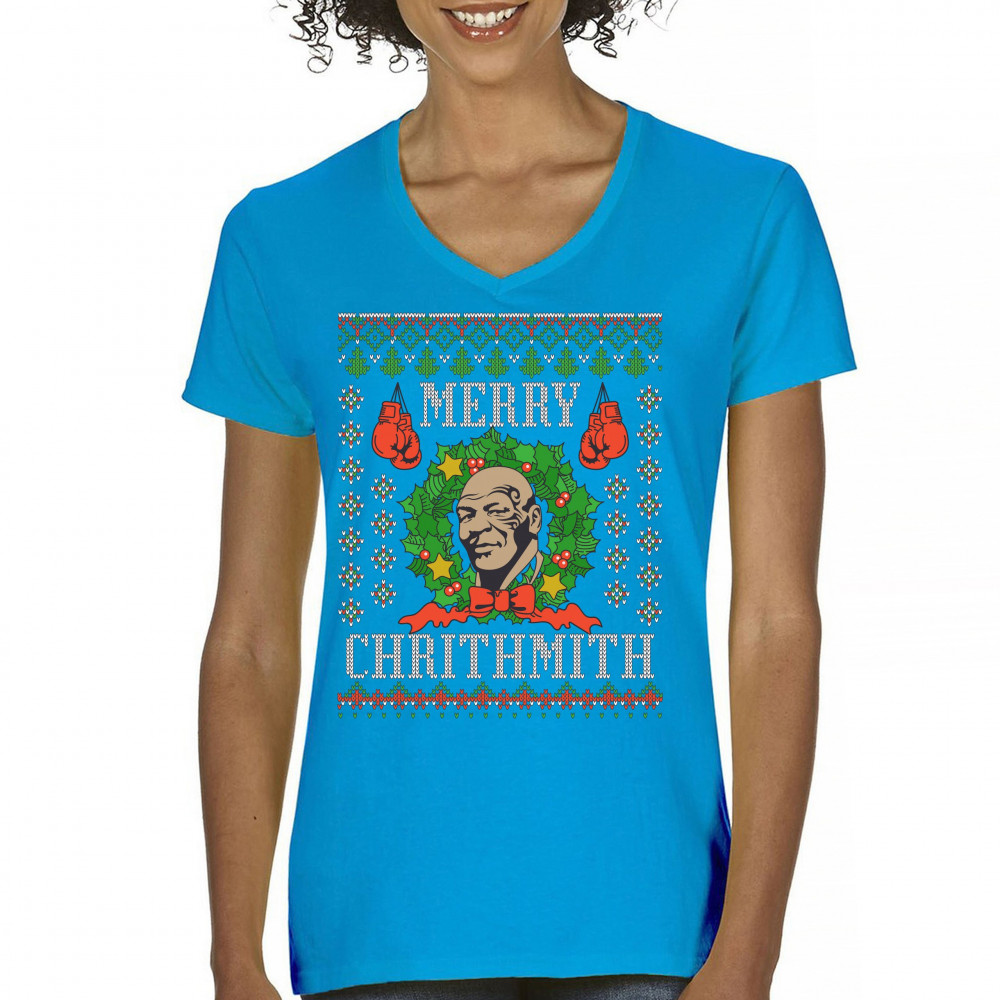 MERRY CHRITHMITH women's v-neck t-shirt mike tyson ugly sweater christmas tee turquoise