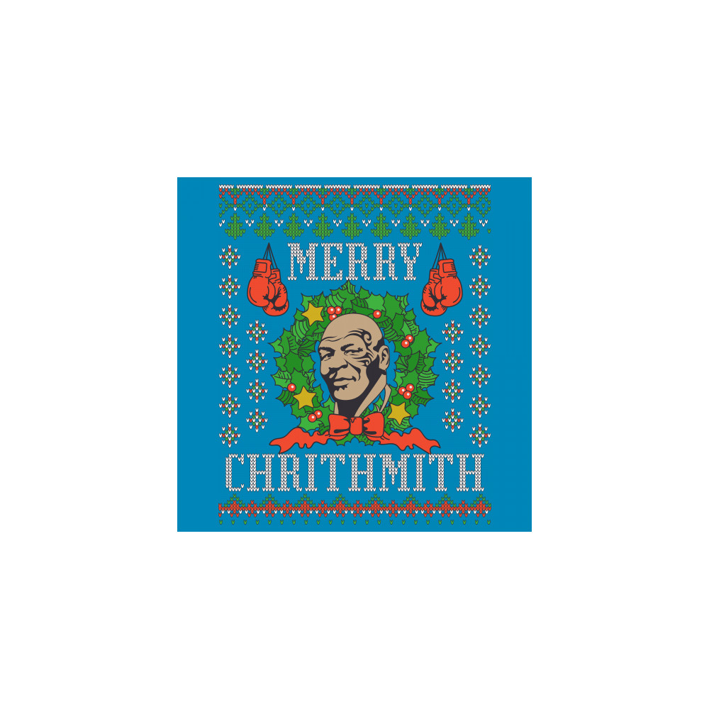 A print saying: "Merry Chrithmith" and featuring the face of Mike Tyson inside of a Christmas chaplet and two pairs of boxing gloves. The print is designed as an ugly sweater. Amazing choice to make people smile and spread positive vibes on Christmas Eve.