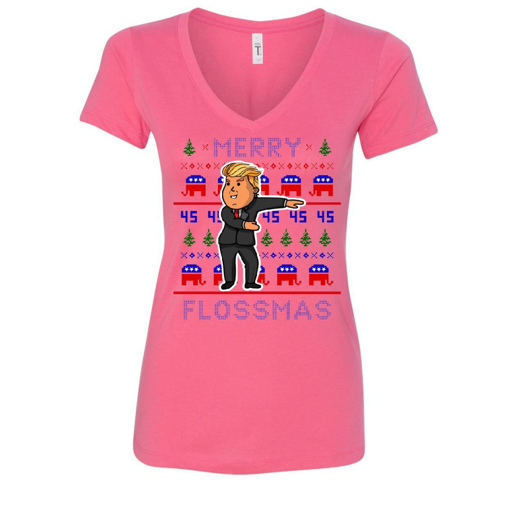 MERRY FLOSSMASS merry flossmas women's v-neck t-shirt christmas xmas ugly sweater trump floss pink