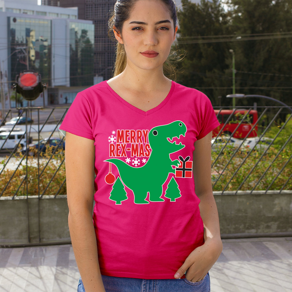 Merry Rex-Mas dinosaur Christmas design with a cute T-Rex, gift, and festive holiday details. Perfect for fun family celebrations and cheerful winter style.