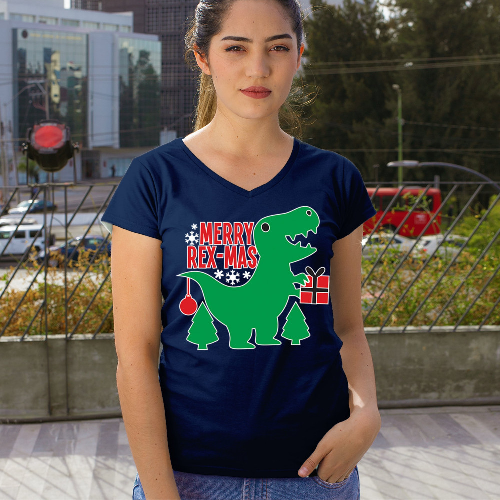 Merry Rex-Mas dinosaur Christmas design with a cute T-Rex, gift, and festive holiday details. Perfect for fun family celebrations and cheerful winter style.