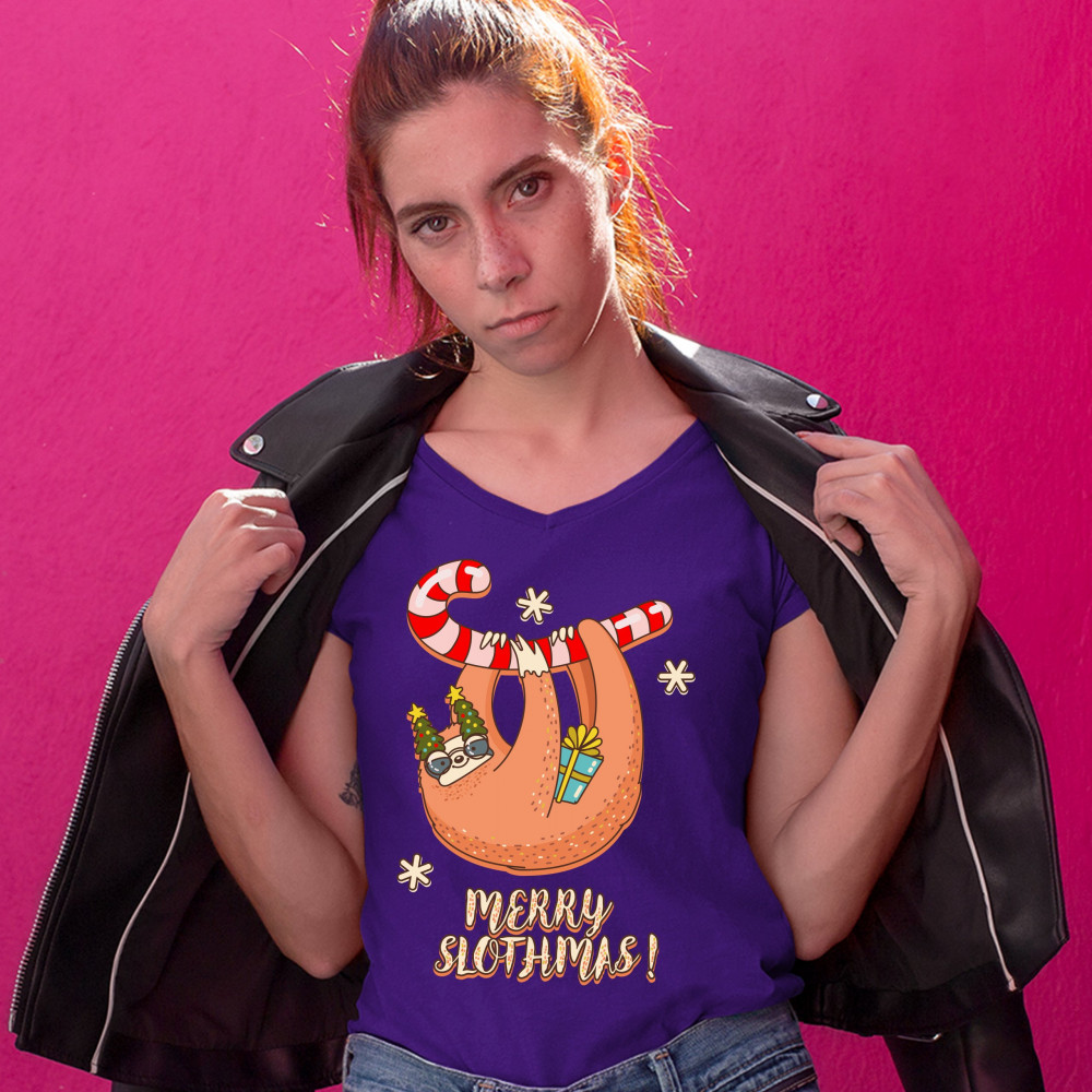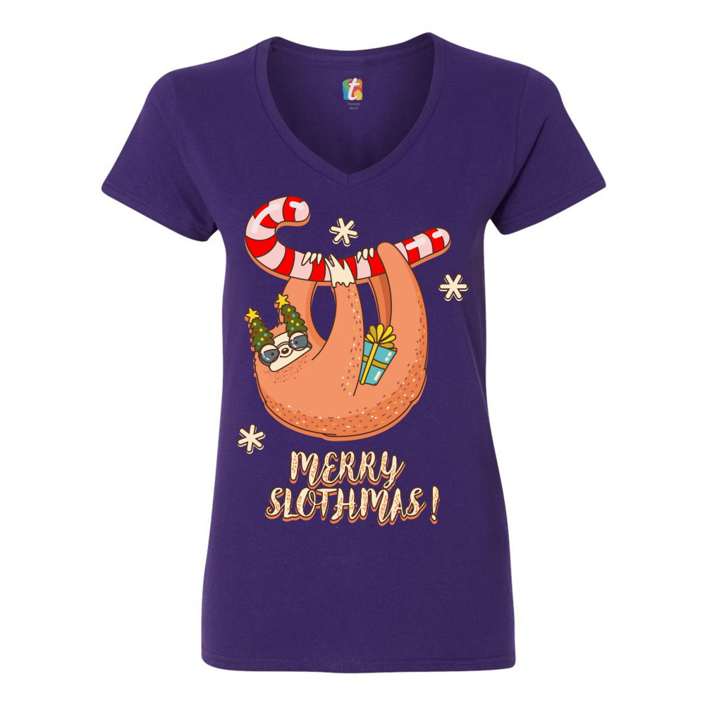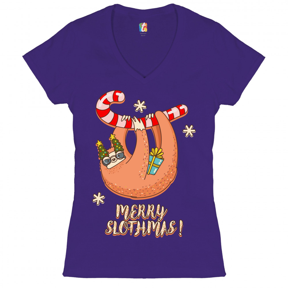 MERRY SLOTHMAS women's v-neck t-shirt christmas sloth candy cane xmas tee purple