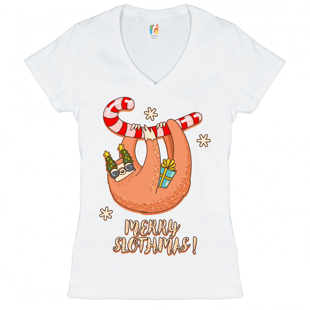 MERRY SLOTHMAS women's v-neck t-shirt christmas sloth candy cane xmas tee white