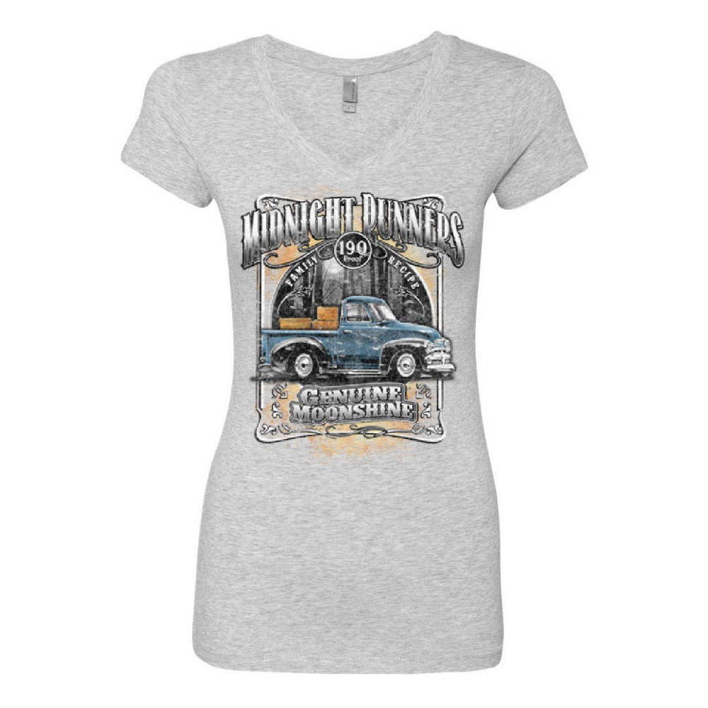 MIDNIGHT RUNNERS women's v-neck t-shirt genuine moonshine drinking whisky booze gray