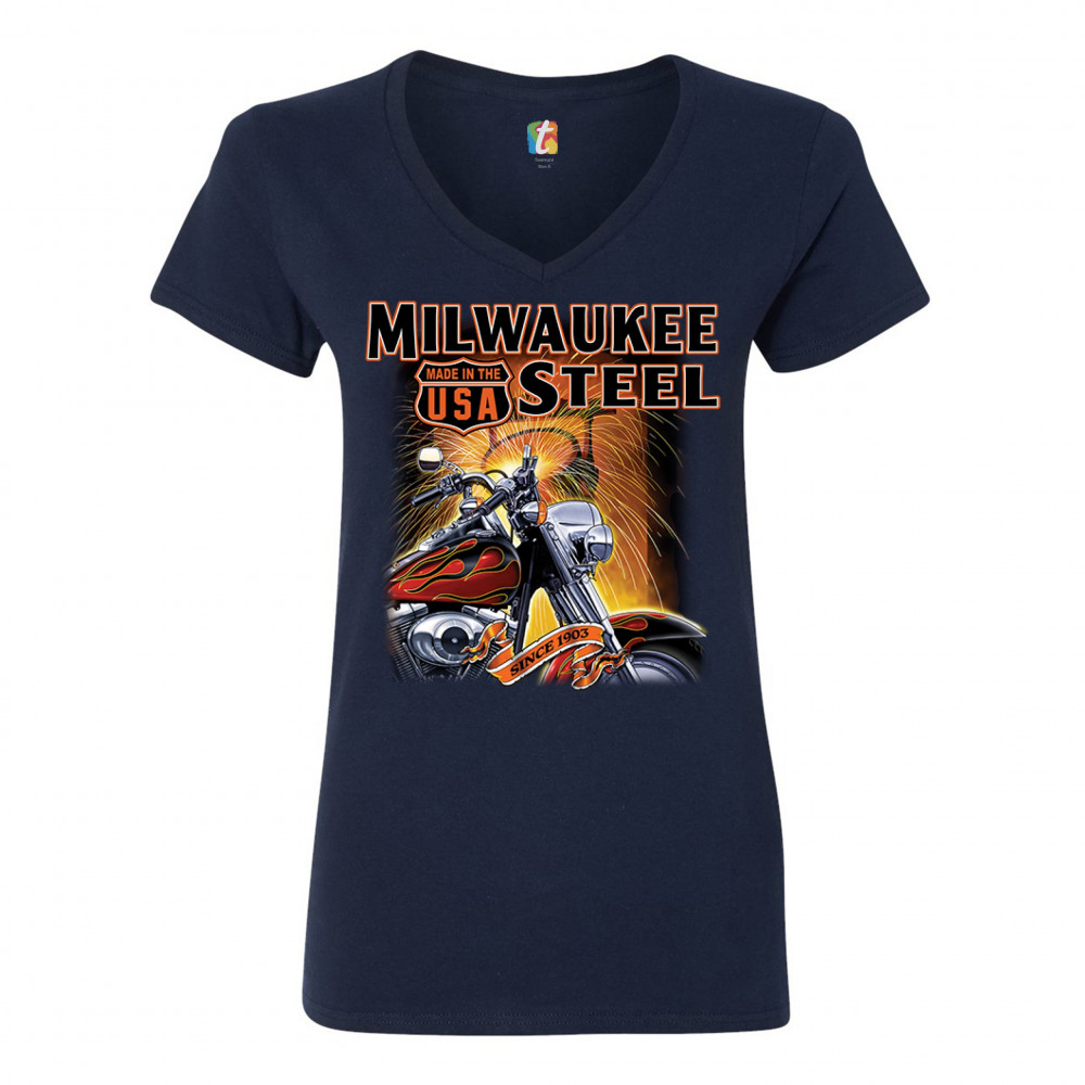 MILWAUKEE STEEL women's v-neck t-shirt route 66 motorcycle chopper biker tee navy blue