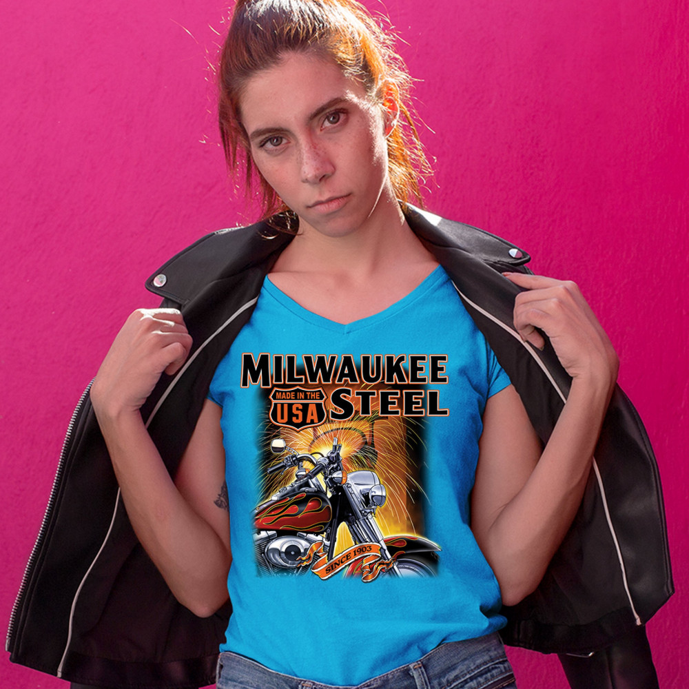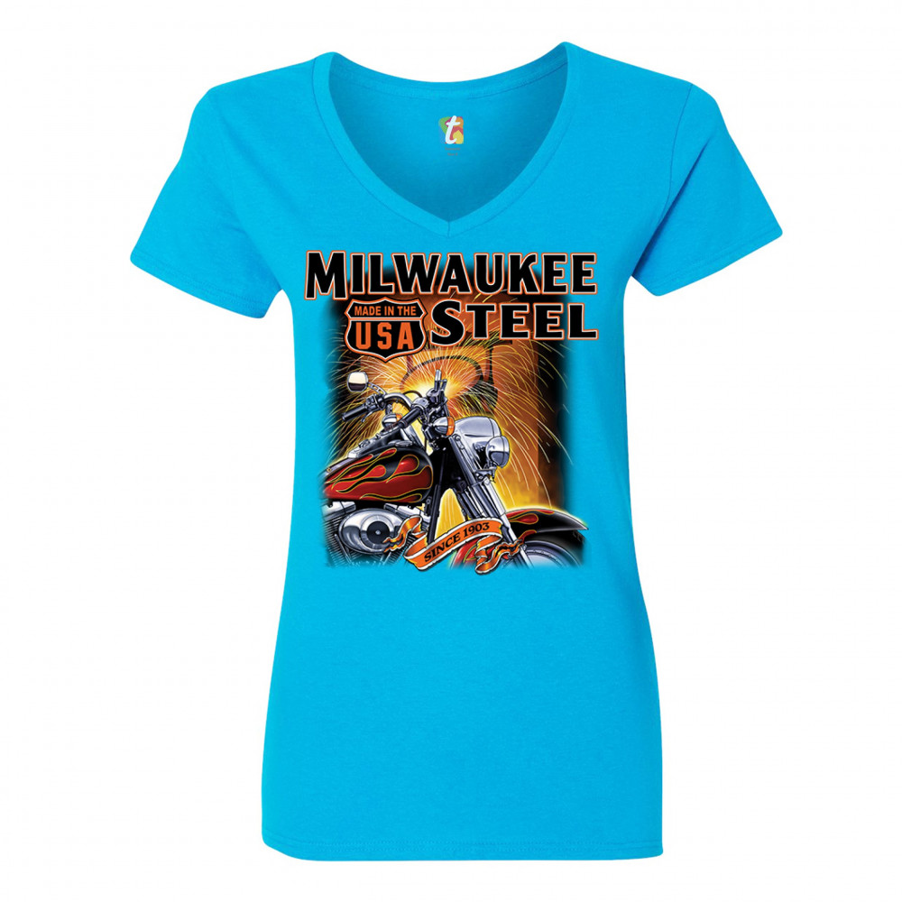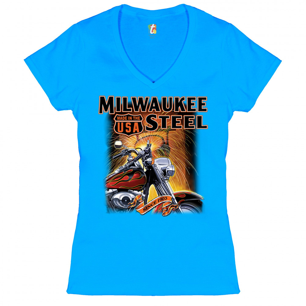 MILWAUKEE STEEL women's v-neck t-shirt route 66 motorcycle chopper biker tee turquoise